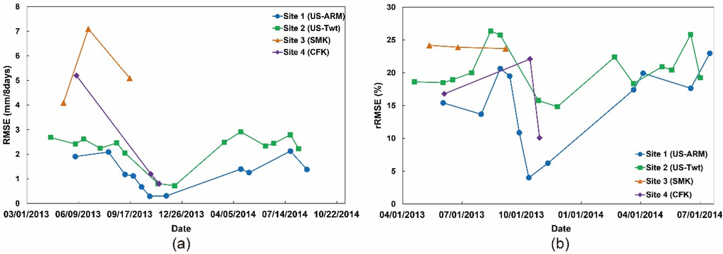 RMSE and rRMSE (%) of Landsat-aggregated 1 km ET against MODIS ET: (a) RMSE and (b) rRMSE (%) for Sites 1, 2, 3, and 4.