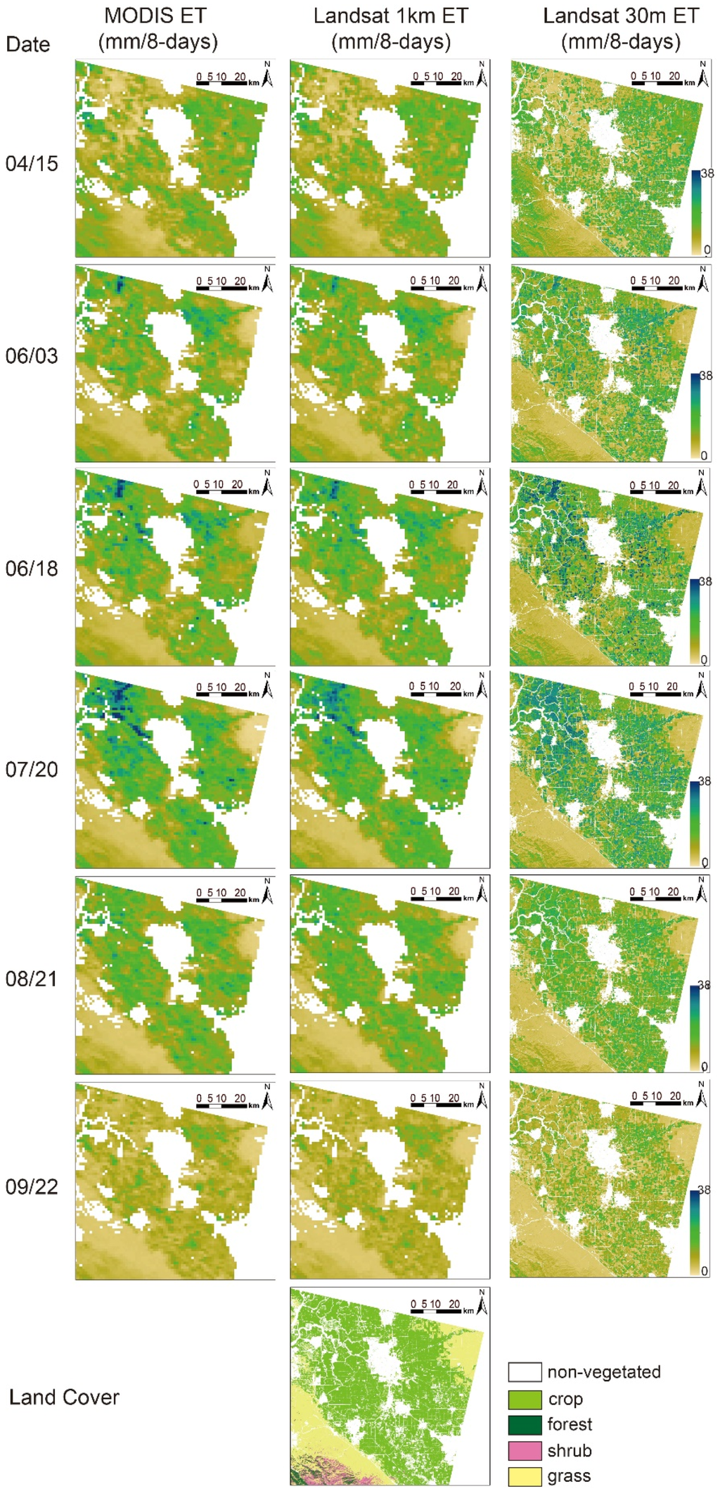 Although MODIS ET products have provided a great opportunity for routine monitoring of land surface conditions at mesoscale, the 1 km ET estimates tend to be inaccurate and are not applicable at field, local, or basin scale because of a high level of spatial heterogeneity of land cover within a pixel. Especially for agriculture applications, MODIS resolution of 1 km is too coarse and may cause significant ET errors since a single pixel is generally larger than individual crop fields. During the last five years, a few methodologies have been proposed for the downscaling of ET from coarser resolution remotely sensed data using information provided by higher resolution imagery. Some studies [,,] introduced disaggregation schemes that have been applied in thermal data fusion by examining the linear relationship between lower and higher resolution ET from multisensor datasets; other research [,] made use of image fusion methods such as the spatial and temporal adaptive reflectance fusion model (STARFM) that was designed for surface reflectance blending. Some studies aimed at improving spatial details of coarse resolution ET based on fine resolution remotely sensed data [,], while others aimed at generating both high spatial and temporal resolution ET [,]. A comprehensive review by Ha et al. [,] stated that although downscaling methods have been widely developed to retrieve high resolution air temperature, precipitation and soil moisture, the approaches specifically for ET downscaling have not been fully explored. The study reviewed 28 downscaling methods used in various disciplines including hydrology, meteorology, image processing, and geostatistics, and addressed the potential of introducing these methods for ET downscaling.