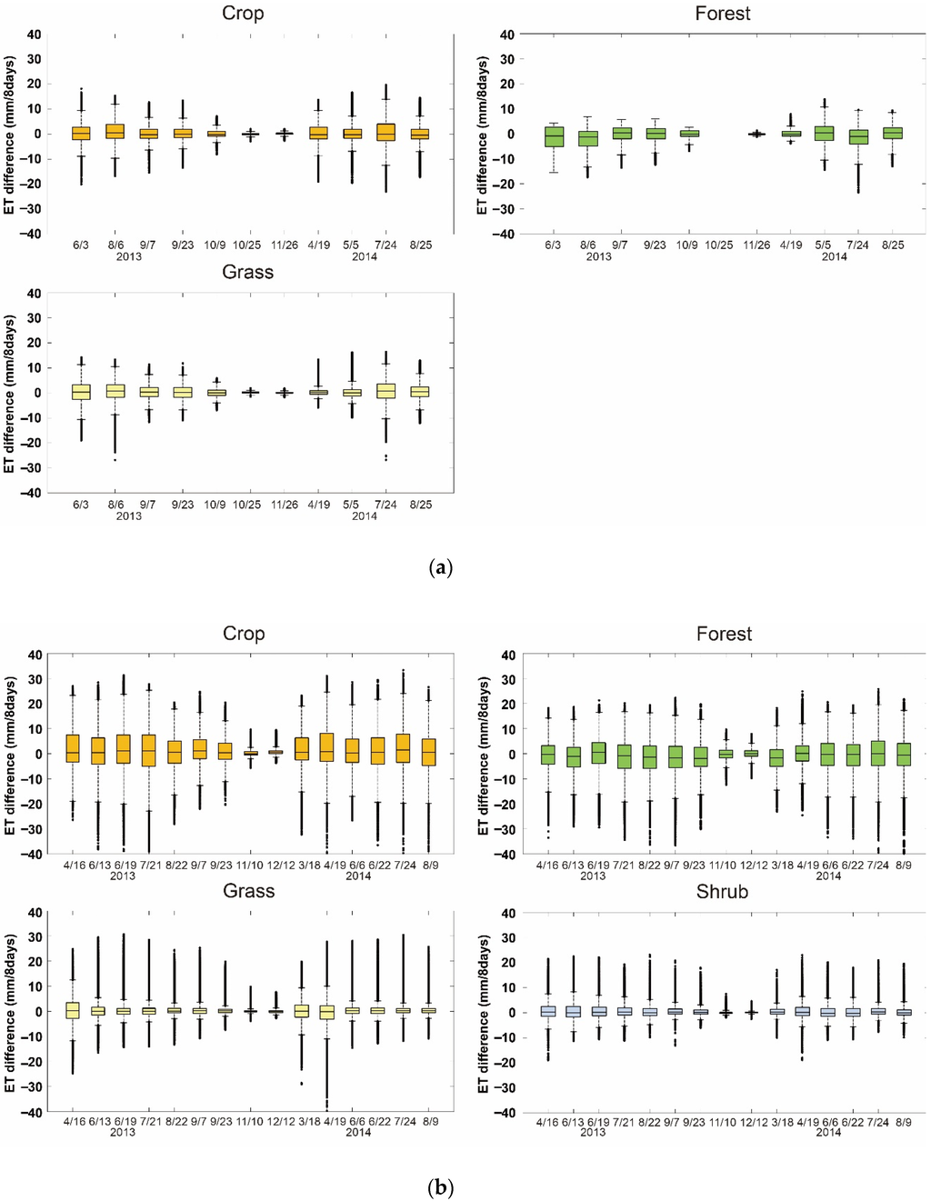 In order to evaluate the improvement of spatial information represented by the downscaled ET, the differences between the 30 m and 1 km MODIS ETs within the corresponding 1 km grids was calculated and the statistics of the differences was analyzed for each land cover type. First, a 1 km land cover layer was generated using 30 m land cover products. The USGS National Land Cover Database (NLCD) 2011 [] was used for US sites and three land cover products (MODIS Global 500m Terra and Aqua combined land cover product (MCD12Q1 IGBP) [], European Space Agency (ESA) Global Land Cover Map 2009 product (GlobCover 2009) [], and the Finer Resolution Observation and Monitoring of Global Land Cover (FROM-GLC) [] were combined for Korea sites to ensure accurate land cover information []. The three products were combined to create a new ensemble 30 m land cover data only using the pixels that agreed from all three land cover layers. Grids with pure land cover types, i.e., a single land cover occupying over 80% of the 1 km grid area were selected for further analysis. Boxplots in Figure 10 show the distribution of the differences between 30 m Landsat downscaled ET and MODIS ET within crop, forest, grass, and shrub land. For all sites, the median of the differences was around zero, indicating an overall unbiased estimation of ET using MODIS ET as a reference. Dispersion of the biases against MODIS ET increased from spring to summer and decreased during winter, implying that the downscaled ET revealed a higher spatial variation during growing seasons. At Site 1, the majority of the differences (25th–75th percentile) was within ±5 mm/8 days, and the extreme difference values were around ±10 mm/8 days. Cropland and forests showed a slightly greater dispersion of the differences than grassland. At Site 2, the difference values were on average within ±5 mm/8 days; the extreme values were on average ±20 mm/8 days at croplands and forest, and ±6 mm/8 days at grassland and shrub area. Sites 3 and 4 showed a similar pattern. For both sites, the majority of the differences (25th–75th percentile) were within ±10 mm/8 days, and the extreme difference values were around ±20 mm/8 days. Dispersion of the biases considerably decreased during the leaf-off season for Site 4, while it was maximized in the middle of the growing season for Site 3.