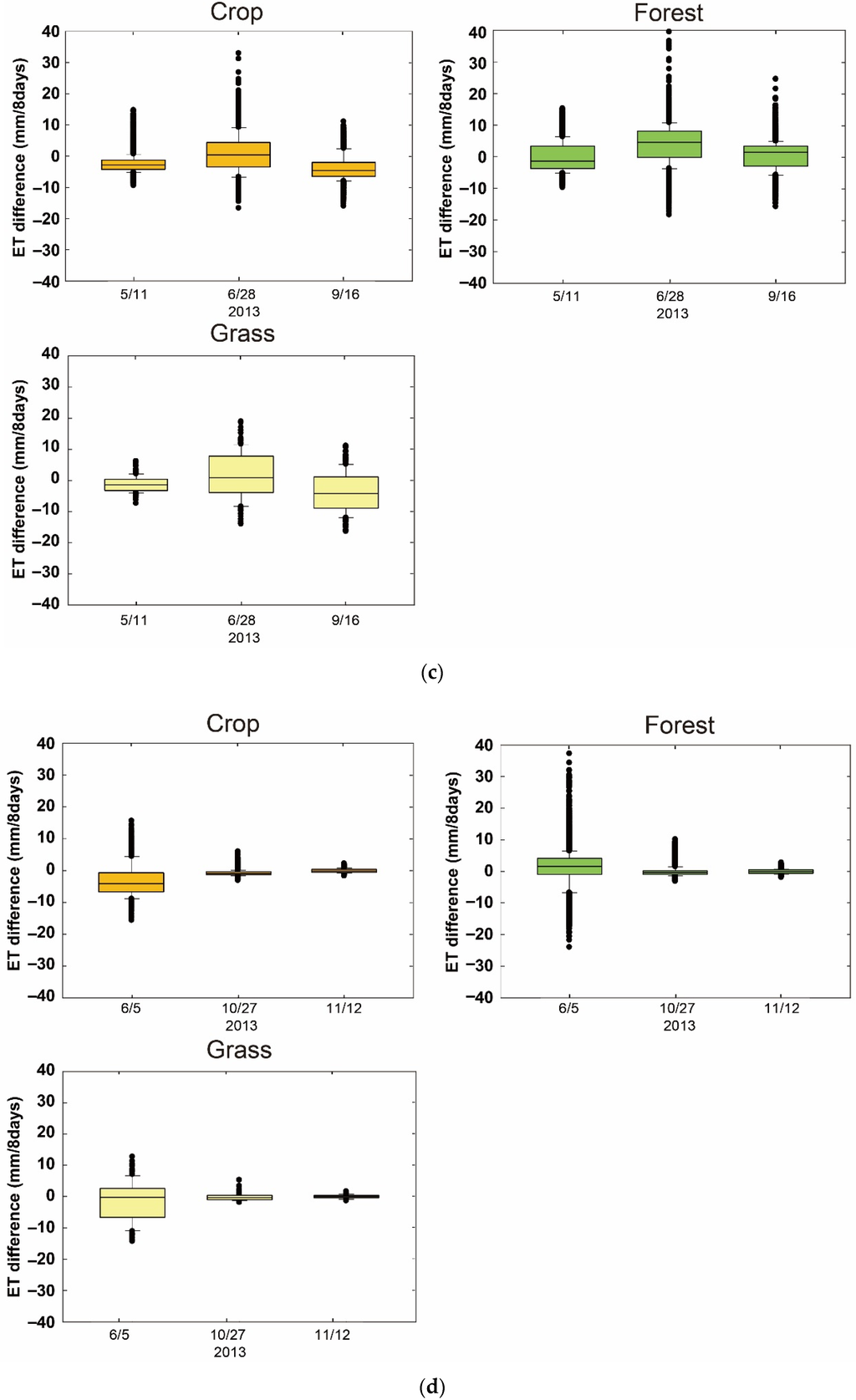 Boxplots of difference between Landsat downscaled 30 m ET and MODIS ET in forest, crop, shrub and grass areas for: (a) Site 1; (b) Site 2; (c) Site 3; and (d) Site 4.