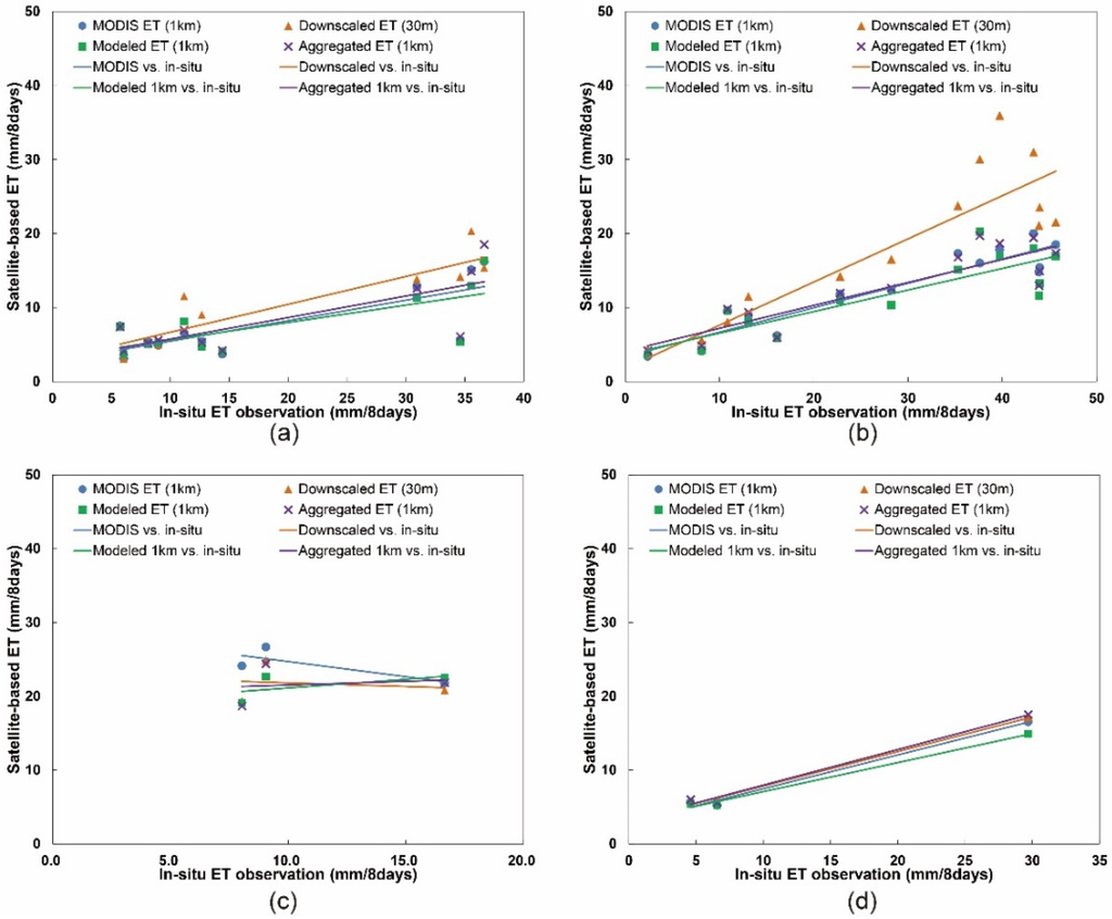 Scatterplots of satellite-based ET against in situ ET at: (a) Site 1; (b) Site 2; (c) Site 3; and (d) Site 4.