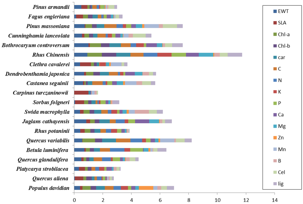 To utilize the spectral variations caused by biochemical differences to predict species diversity, the essential prerequisite is to ensure the biochemical diversity among species. In this study, we standardize the absolute value of each measured leaf biochemical constituent (Table 1) to visually determine inter-species variation in leaf biochemical contents (Figure 2). The length of each color segment expresses absolute biochemical differences among species and the relative importance of each leaf biochemical component to the total biochemical portfolio of species. For single biochemical components, no two species are absolutely equal, but many are quite similar. However, the combination of leaf biochemical components is different for any two species. For example, the EWT contents in Clethra cavalerei and Swida macrophylla are similar, but their carotenoid contents are quite different. The biochemical diversity between species will increase when additional biochemical components are combined.