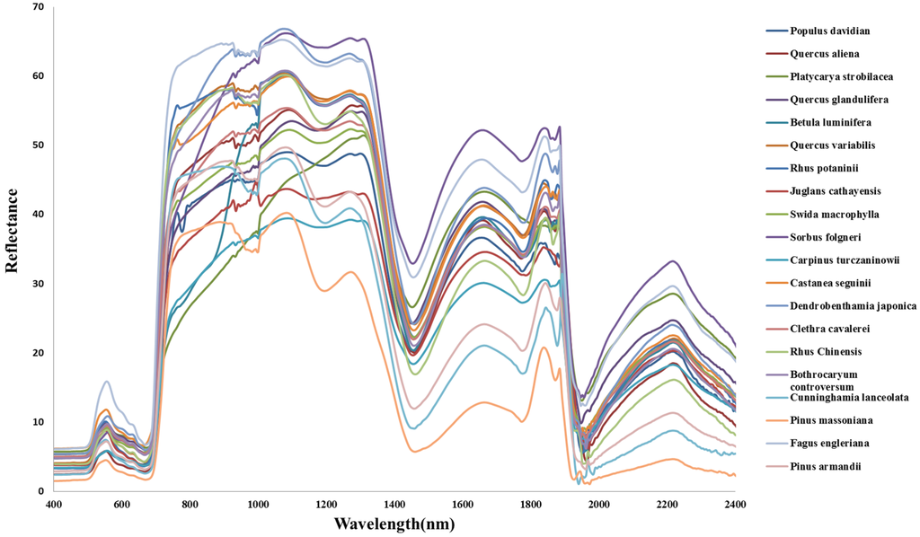 Spectroscopy. Hemispherical reflectance spectra with 350–2500 nm wavelengths were measured on 10 fresh leaves of each species immediately after detachment from the branch in the field. The leaf spectral reflectance was obtained using a portable field spectrometer SVC HR-768i (Spectra Vista, Poughkeepsie, NY, USA) attached via a fiber optic cable to a Li-Cor 1800 integrating sphere (Li-Cor 1800-12S, Li-COR, Inc., Lincoln, NE, USA) with a light source for full-range spectral measurements. The SVC spectrometer acquired measurements with a 1.5-nm spectral sampling interval in 350–1000 nm, 7.6 nm in 1000–1890 and 5 nm in 1890–2500. However, some data with a wavelength less than 400 nm and more than 2400 nm were unavailable because of a large amount of noise. Hence, they were excluded. The measured leaf spectra of each species were then averaged to minimize the effect of noise on the spectral response. A moving Savitzky–Golay filter [38] was finally applied to further smooth the spectra.