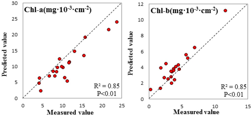 PLS scatterplots show the relationship between the field-measured biochemical components and those predicted by the field spectral reflectance.