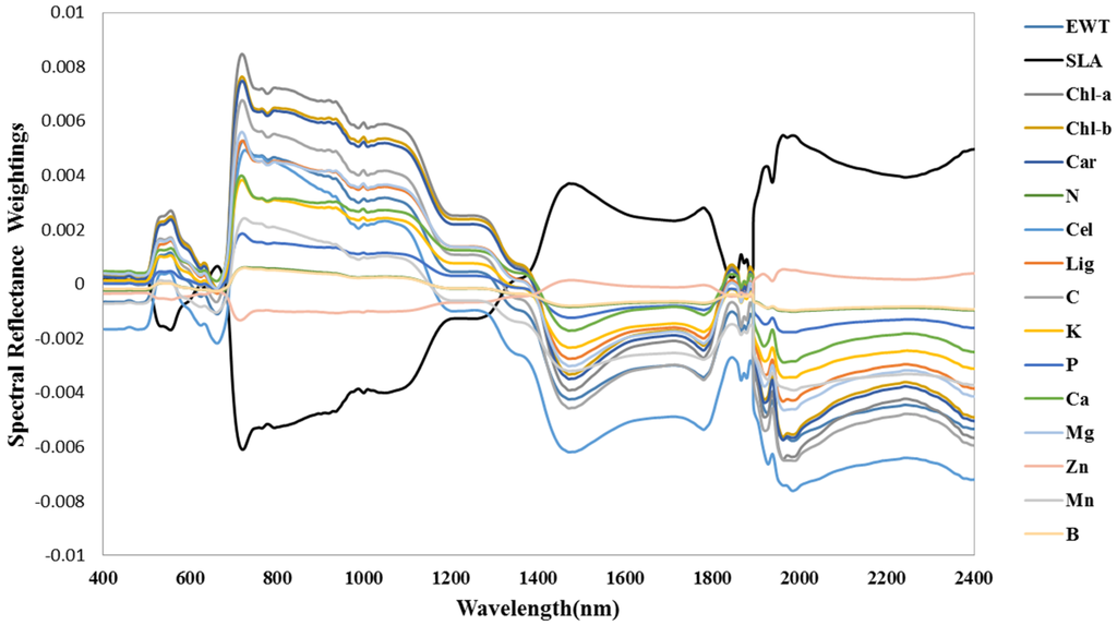 The spectral reflectance weightings of the PLS regression analysis reveal the wavelength-specific importance for predicting the fifteen leaf chemical properties and SLA (Figure 6). The wavelengths of maximum importance are those with spectral reflectance weightings that diverge from zero. Although the spectral reflectance weightings are variable for different leaf chemical components, their change tendencies are almost consistent (except Zn) but opposite those of SLA. This may be explained by our area-basis biochemical measurements. In the VIR (especially within 500–700 nm), the strong PLS reflectance weightings indicate that the most important contributions come from Chl-a, Chl-b and Car, followed by SLA, C, Mg, Lig, Ca, K, N, P, Cel and others less so. The spectral reflectance weightings in the NIR are similar to those in the VIR, but EWT is also an important contributor. Cel, C, SLA and most pigments play a significant role in controlling the SWIR reflectance among species.