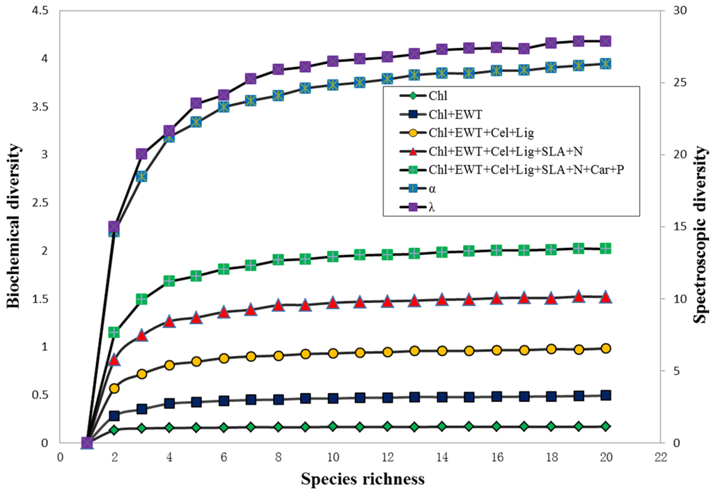 Figure 7 shows changes in biochemical and spectroscopic diversity with increased species richness based on the different biochemical component combinations using Monte-Carlo simulation. As the species richness increases, the biochemical and spectroscopic diversity raise nonlinearly, finally reaching saturation. A comparison of different numbers of combinations of biochemical components indicates that the higher numbers of biochemical combinations reach saturation later. Overall, the combination of all 16 measured biochemical components (α) could provide more richness for tracking species diversity. It is also notable that the spectroscopic diversity for tracking species richness performed better than the biochemical diversity. This may be due to more biochemical and structural information being contained in the spectral properties of species.