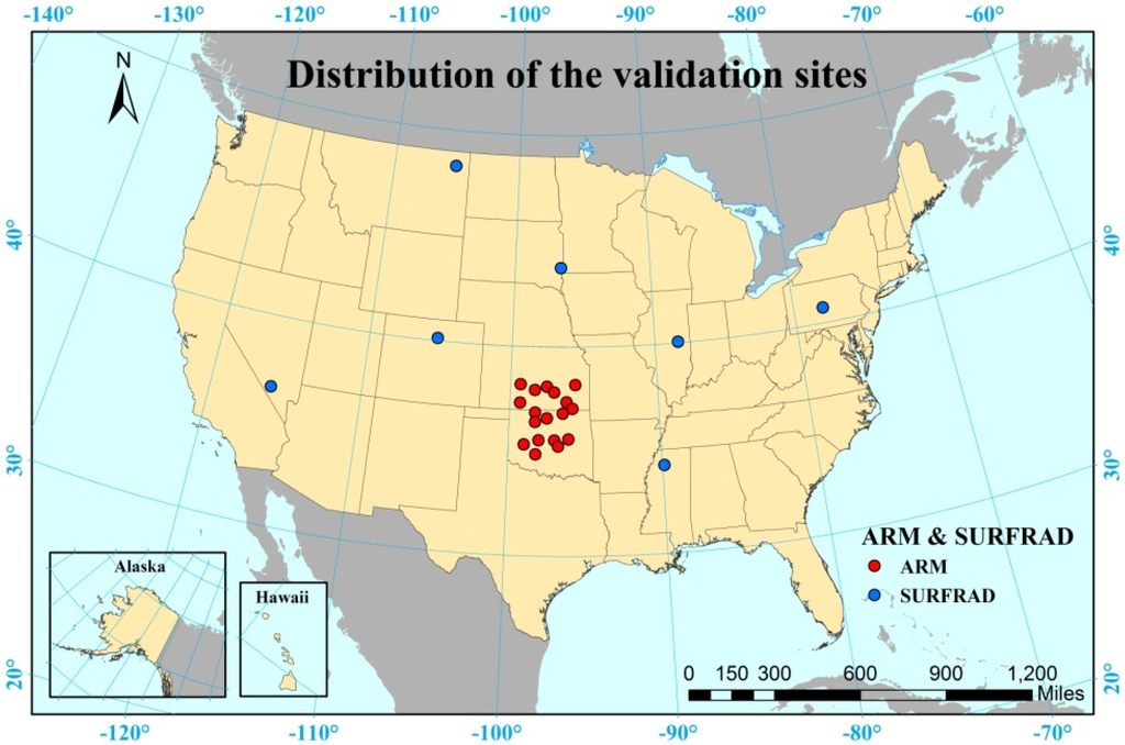 As described above, more than 8000 validation samples were selected from the observations made in 2008, and most of them were from 25 sites. Table 3 gives detailed information about these sites, which were mainly from the ARM (http://www.arm.gov/) and SURFRAD (http://www.srrb.noaa.gov; []) observation networks. This ensures that the data are of the best quality currently available. The distribution of the 25 sites is shown in Figure 1. All ARM and SURFRAD data are carefully checked, and quality-control information is supplied with the data (ftp://aftp.cmdl.noaa.gov/data/radiation/surfrad/) and http://www.archive.arm.gov/; []).