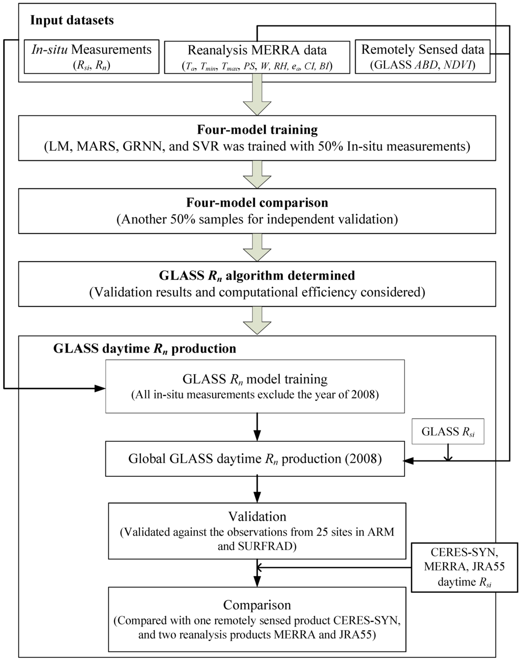 The overall flowchart of this study is shown in Figure 2. First, the GLASS Rn algorithm was determined by comparing four Rn estimation models (Section 3), including the multivariate adaptive regression splines (MARS), the support vector regression (SVR) model, a linear regression model (LM) [], and a general regression neural network (GRNN) model []. To the best of our knowledge, the first two models are the first to be applied for estimating surface net radiation. The details of the MARS model are introduced in this section, while the other three models are outlined in the Appendix. After validation and inter-comparison, the MARS model was determined to generate the GLASS daytime Rn product. Second, the MARS model was applied to the all-wave daytime Rn product by converting the GLASS Rsi product using other satellite products (e.g., NDVI and albedo) and meteorological information from MERRA (Section 4.1). Finally, the accuracy of the new GLASS Rn product was evaluated by validating it against the site observations and comparing it with other Rn products: one remotely sensed product (CERES-SYN), and two reanalysis products (MERRA and JRA55) (Section 4.2).