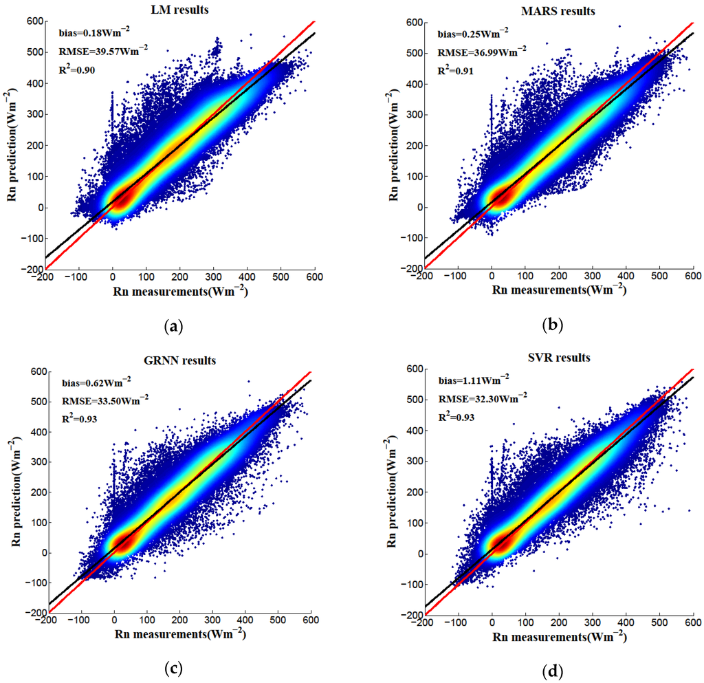The primary objective of this study is to generate the accurate long-term high-resolution Global LAnd Surface Satellite (GLASS) Rn product. The GLASS product suite is for the long-term environmental change studies [,] and continuously expanding. For generating such a global product, algorithm development is the key and we must therefore balance the accuracy and computational efficiency of the algorithm. To achieve this objective, we explore two new nonlinear models: Multivariate Adaptive Regression Splines (MARS) and Support Vector Regression (SVR). After comparing them with two models developed earlier [,], we select the MARS model to produce the GLASS Rn product at a 5 km spatial resolution. The resulting high-resolution GLASS Rn product is further validated, compared with one satellite product and two reanalysis products. The details are presented in the following sections.