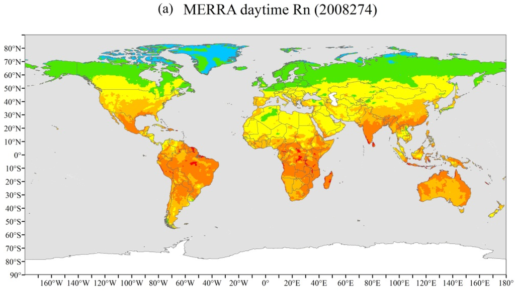 Alternative methods for obtaining Rn are meteorological reanalysis and satellite remote sensing []. Table 1 gives detailed information about the commonly used Rn products. Reanalysis products are usually derived by merging available observations with an atmospheric model to obtain the best estimate of the states of the atmosphere and land surface [], while existing remote sensing products are generated mostly based on a radiative transfer model with inputted atmospheric and surface parameters. From Table 1, we can see that the spatial resolutions of these products are too coarse for many land applications although they are temporally continuous and globally complete. Another issue is that the accuracies of these products vary considerably and may not meet the application requirements, such as the global change research [,,]. Therefore, a new long-time high-resolution global Rn product with both high accuracy and fine temporal-spatial resolutions is urgently needed.