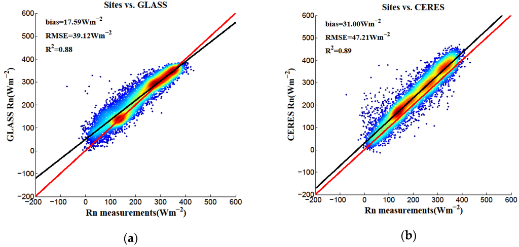 Many geostationary and polar-orbiting satellite data are at the kilometer spatial resolution and can be potentially used for estimating the individual components of Equation (1), such as incident shortwave radiation [] and albedo [,]. If all components in Equation (1) are known, the calculation of Rn is straightforward []. The difficulty in generating the global Rn product using Equation (1) is the estimation of the thermal components under the cloudy conditions. This is the reason why many studies focus primarily only on shortwave [,,] or clear-sky conditions []. If we know the exact atmospheric and surface properties, radiative transfer models enable us to calculate surface net radiation. However, it is extremely difficult to generate a complete set of atmosphere and surface products for model calculation at a high resolution. The most practical solution is to estimate incident shortwave radiation directly from satellite observations and then convert it into all-wave net radiation using either linear [,,,,] or nonlinear [,] models. Jiang et al. [] recently developed two artificial neuron networks models using comprehensive global in situ observations and found that the nonlinear models can produce better accuracy than the linear models.
