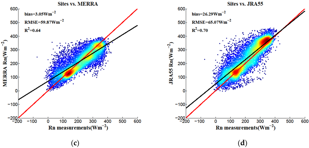 For further evaluation, one remotely sensed product (CERES-SYN) and two model reanalysis products (MERRA and JRA55) were used for inter-comparison with the GLASS Rn product; spatio-temporal information about the datasets is given in Table 1. The CERES-SYN product is obtained by merging CERES observations aboard the NASA Terra and Aqua satellites with radiances observed from five geostationary satellites [,]. The MERRA product is provided by NASA’s Global Modeling and Assimilation Office (GAMO); it is designed to integrate with NASA’s Earth Observing System (EOS) satellite data for use in climate analysis []. JRA55 is offered by the Japan Meteorological Agency (JMA) by using the TL319 version of JMA’s operational data assimilation system in which several newly available and improved past observations were used. JRA55 is recognized as an upgrade to JRA 25 and is considerably better than JRA25 [,]. After transferring to the local time of each pixel, the three products were integrated into a daytime temporal scale according to the sunrise and sunset time, and then, along with the GLASS daytime Rn product, they were validated against the respective in situ measurements; the results are shown in Figure 5.