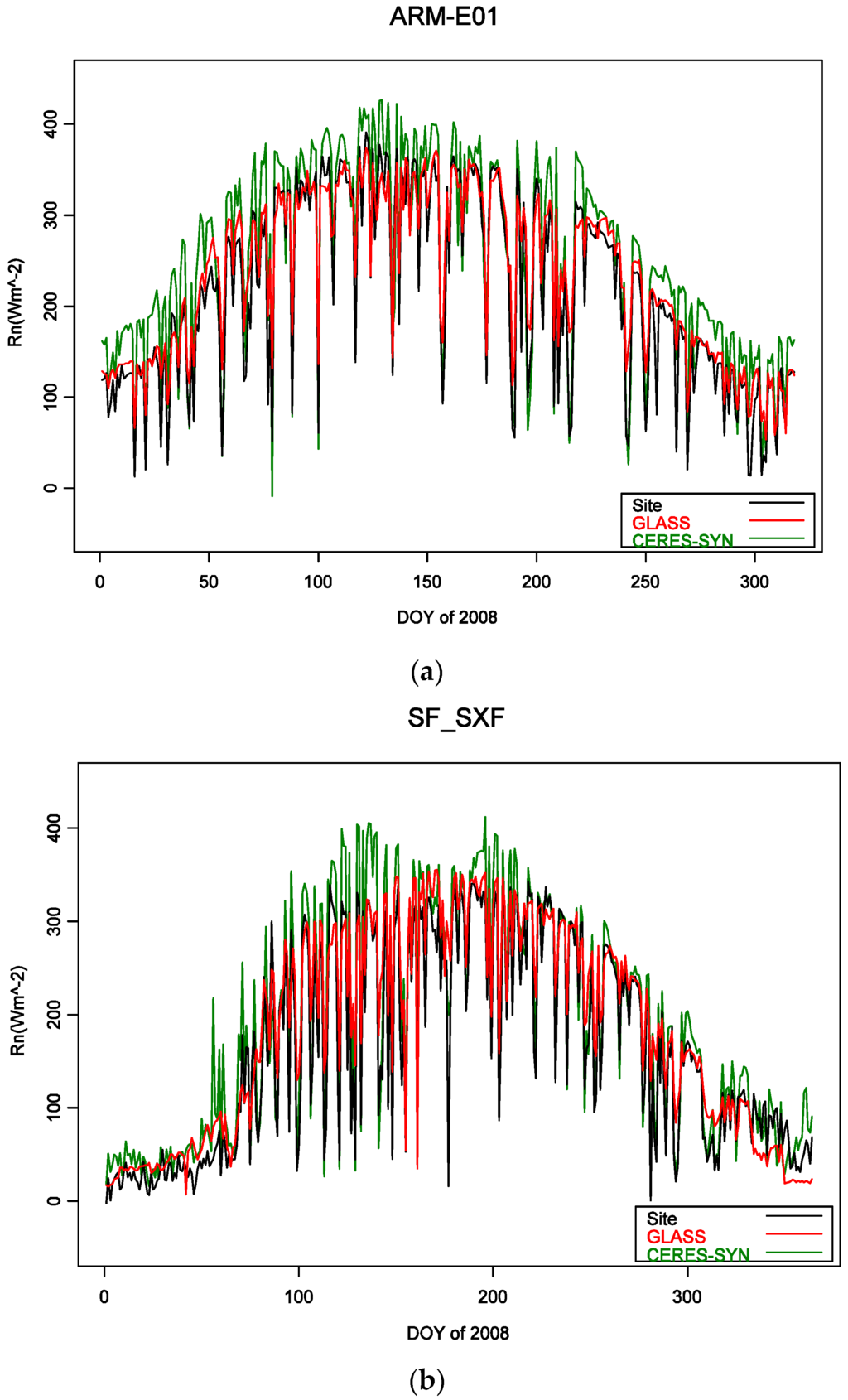 Two site examples are also given in Figure 6. Here, the CERES-SYN product was selected because of its best performance among the three products. The two plots show that the GLASS daytime Rn matched the site observations very well and that the CERES-SYN product was larger than the measurements and the GLASS product although the variations were reasonable. Overall, the GLASS daytime Rn product has the potential to be one of the best Rn products available for future applications.