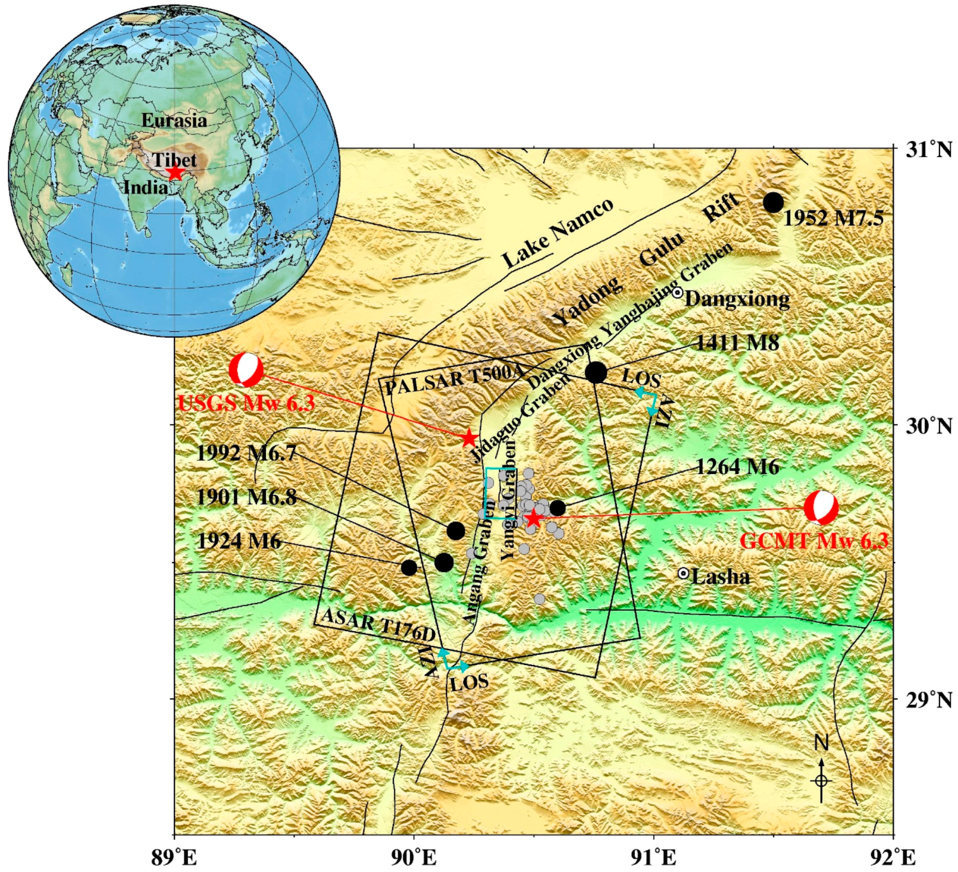 - Wu, Z.H.; Ye, P.S.; Barosh, P.J.; Wu, Z.H. The 6 October 2008 MW 6.3 magnitude Damxung earthquake, Yadong-Gulu rift, Tibet, and implications for present-day crustal deformation within Tibet. J. Asian Earth Sci. 2011, 40, 943–957. [Google Scholar] [CrossRef]