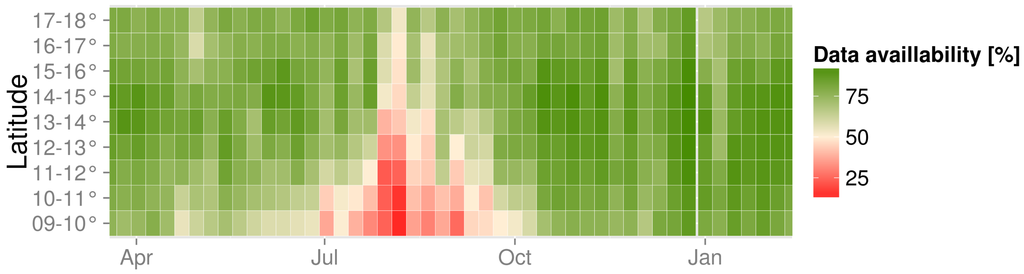 Percentage of data available for each degree of latitude ranging from 9°to 18°. Low data availability is observed in low latitudes and during vegetation growth (from July to October).