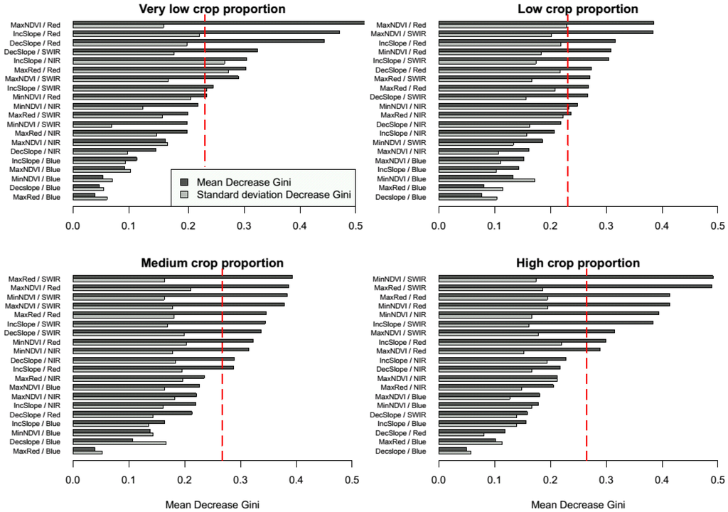 A preliminary analysis of the respective spectral-temporal features’ contribution was completed to identify the subset of the twenty spectral-temporal features that maximizes the classification accuracy. Twenty spectral-temporal features could increase both noise and processing time. A random forest algorithm was run to calculate the spectral-temporal feature importance by turning off one feature (while others remained constant) and computing the resulting loss in accuracy through the mean decrease in the Gini index (GI) [60]. This analysis carried out for four classes of crop proportions calculated on quantiles: very low crop proportion (<1.4%), low crop proportion (1.4%–4.4%), medium crop proportion (4.4%–17.8%) and high crop proportion (17.8%–72.2%) (Figure 8). The distribution of crops varies across a latitudinal gradient with a higher proportion of crops between 10 and 13 of latitude.
