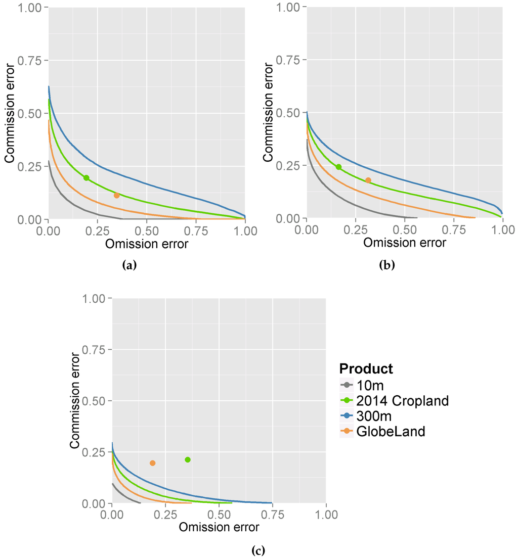 Three examples of Pareto boundary, commission and omission errors for GlobeLand 30 and 2014 Sudano-Sahelian Cropland map. Pareto boundaries were also computed for a 10-m product and a 300-m product. (a) Site in center Mali ; (b) Site in Sikasso region (Mali South East); (c) Site in South Mali.