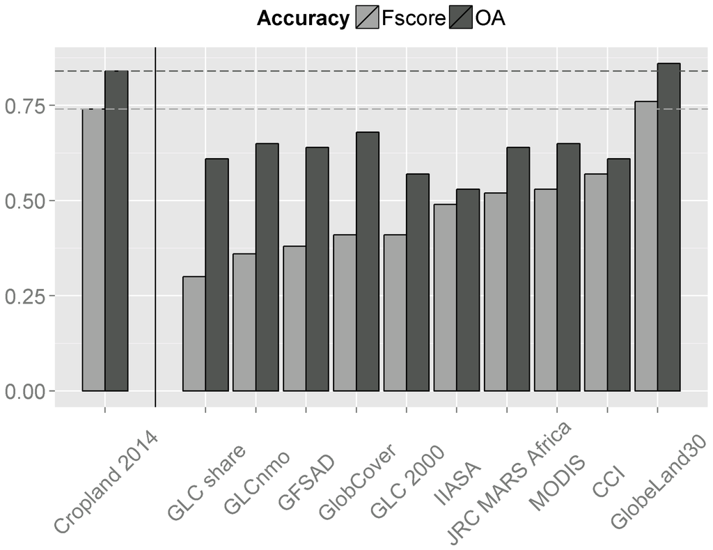 To further identify the accuracy of the products, it is of paramount interest to focus the analysis on challenging areas where most discrepancies between maps are observed. A global agreement map built from the global products (see Table 1) ranges from zero, where all products agree on the non-crop class, to ten, where all products agree on the crop class. A value of five represents the highest disagreement between products as five products classified the pixel as crop and five classified the pixel as non-crop. OA and F-score were computed for each of the eleven classes of agreement using the validation points belonging to that class. The OAs of all global products, except GlobeLand 30 and the 2014 Sudano-Sahelian Cropland map, have a similar behavior (Figure 17). The highest accuracy of the majority of products is met in regions labeled as non-crop by all products, and accuracy then drops until values around 0.45, when most products disagree. Finally, OA increases to yield an accuracy of 0.8 when all products agree on crop class. GlobeLand 30 and the cropland map produced in this study have a nearly identical profile, which could be summarized as a slight decrease in accuracy when agreement on crop arises. F-score increases when agreement on crop occurs. GlobeLand 30 and the 2014 Sudano-Sahelian Cropland map behave very differently to others. The F-score of the new product and GlobeLand 30 starts with a higher value in regions where many products agree on non-crop. This means that these two products correctly label crops in regions where almost all global products mislabeled crop as non-crop.