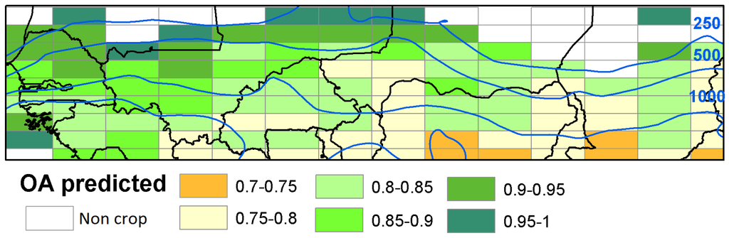 Misclassifications are mainly explained by low data availability due to high cloud cover during vegetation growth (25% of OA explained by data availability) and by landscape fragmentation (39% of OA explained by fragmentation). Remaining errors in the training dataset are minimized by the stringent trimming procedure limits, from which 30% of the best points were retained. Highly fragmented landscape is better captured by high resolution images as demonstrated with Pareto boundaries. The Sentinel 2, 5-day coverage at 10-m in 13 spectral bands, will probably offer a good combination of spatial-spectral and temporal resolution. Landsat 8, 16-day coverage at 30-m in 11 spectral bands, offers a spatial resolution able to catch the landscape fragmentation of the study region. Nevertheless, the temporal coverage might be too small to catch vegetation behavior during the vegetation growth. Remaining errors in the training dataset are minimized by the strong trimming procedure limits. Discrepancies between the GlobeLand 30 product and the 2014 Sudano-Sahelian Cropland map can partly be linked to the time production of the map, the spatial resolution, the input data and the interactive verification for GlobeLand 30.