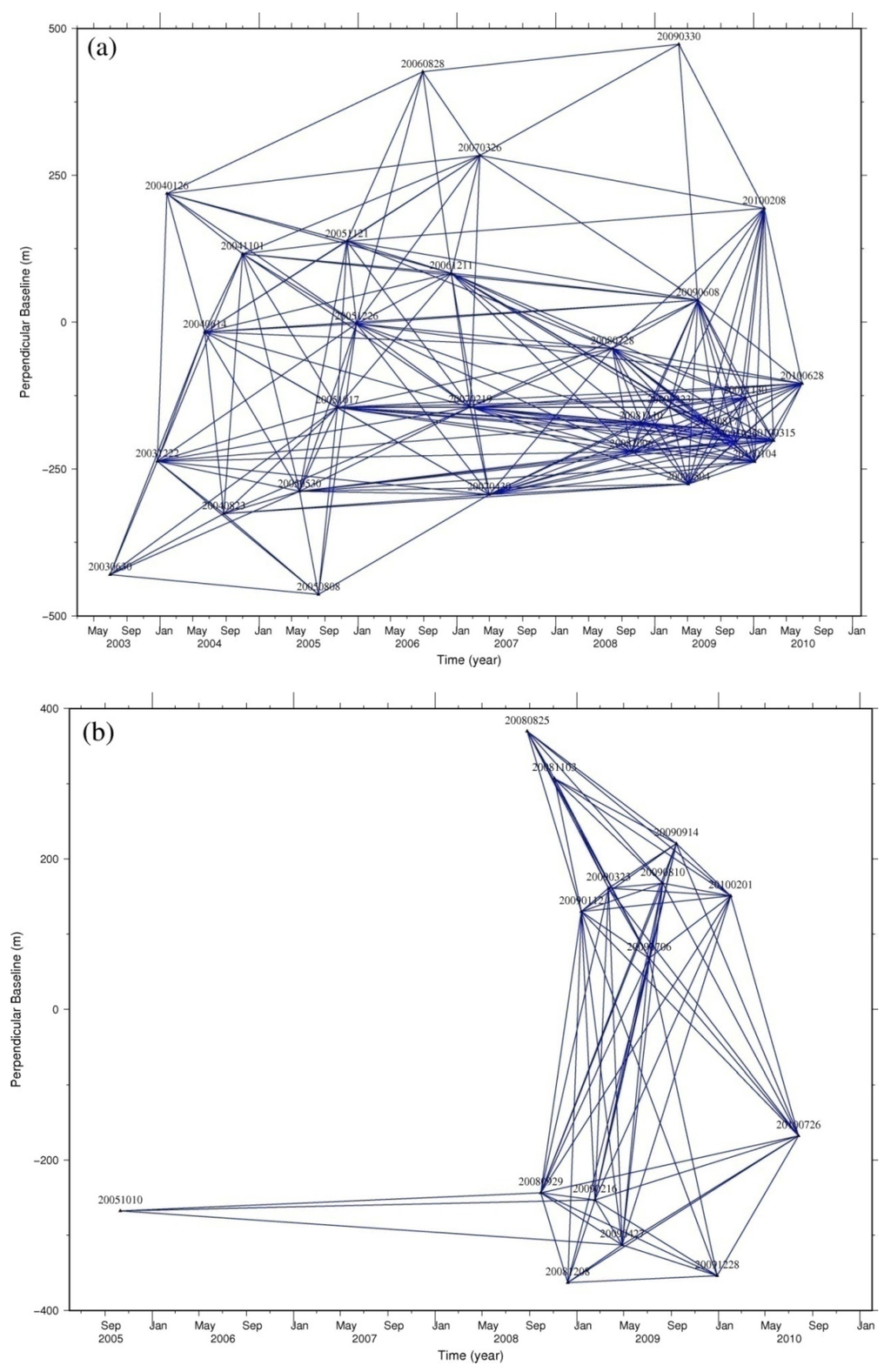Synthetic aperture radar images from the advanced SAR (ASAR) instrument on board the ENVISAT satellite were used in this study to investigate interseismic deformation across the ATF at 85°E. The data set was acquired between June 2003 and June 2010, and includes 33 descending images and 15 ascending images. The raw data were processed with repeat orbit interferometry package (ROI_PAC) Version 3.1 beta [30]. Precise DORIS orbital data for ENVISAT satellite provided by ESA has been used for interferometric processing. All of the interferograms were produced using the NSBAS package [31,32]. Image pairs were selected by spatial and temporal baselines: (i) Bt < 1 year and Bs < 500 m; (ii) Bt < 3 year and Bs < 300 m; and (iii) Bt < 5 year and Bs < 100 m (Figure 2). In ascending track 298, the 10 October 2005data extends the time baseline from 2 to 5 years, which is significant for the time series deformation analysis. Unlike ROI_PAC, the NSBAS takes into account the DEM when co-registering images [33], which improved the interferometric processing and increased the coherence of interferograms.