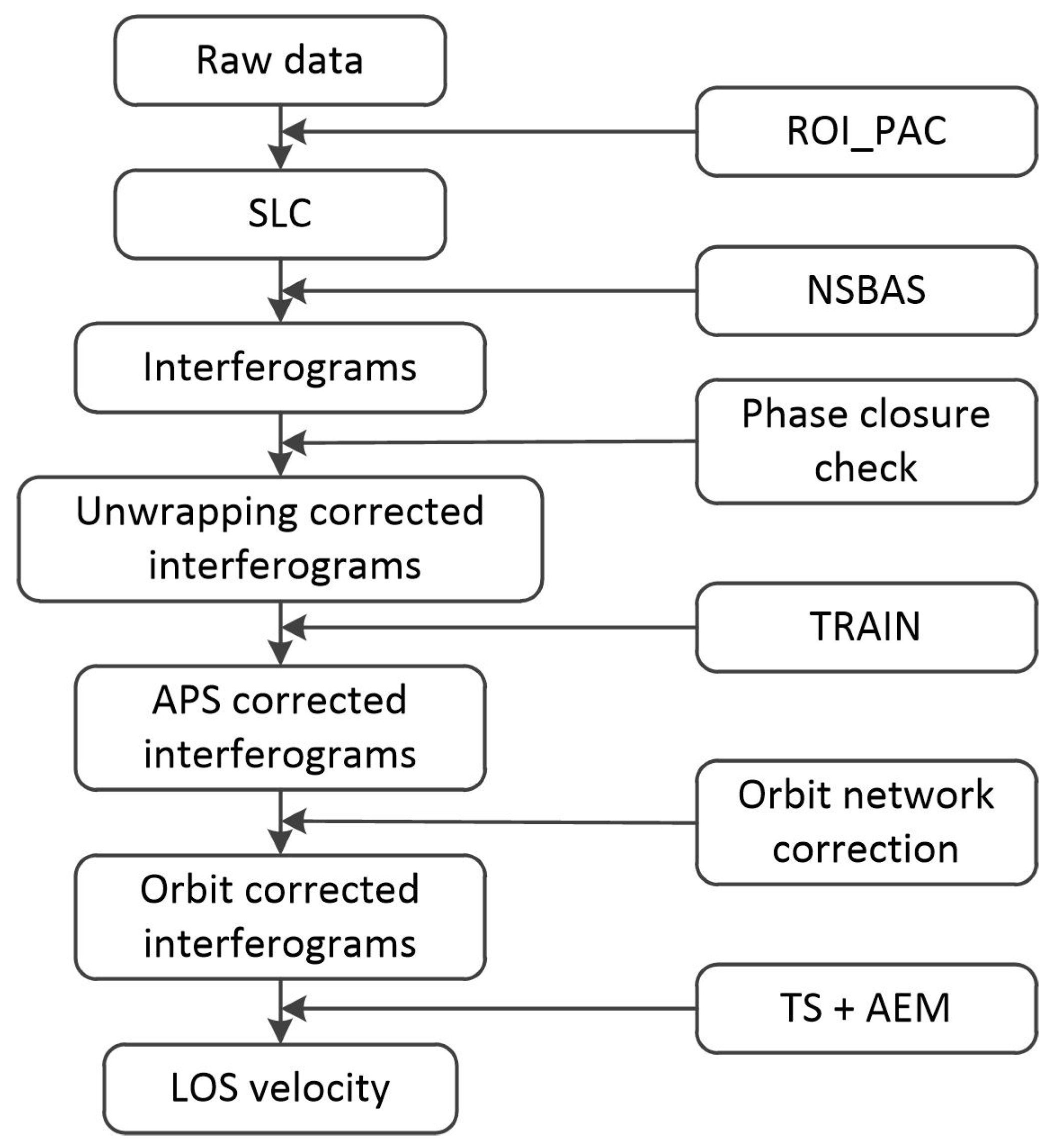 A LOS rate map is calculated from the interferograms corrected for both atmospheric and orbital errors using the InSAR TS + AEM package developed at the University of Glasgow based on the SBAS algorithm [59,60,61] as the flow chart in Figure 4. The RMS between LOS deformation derived from the InSAR TS + AEM package and GPS measurements is smaller than 0.5 mm/year, which was validated independently by Li et al. (Abstract G13B-07 presented at Fall Meeting. 2010, AGU, San Francisco, CA, USA) and Hammond et al. [62].