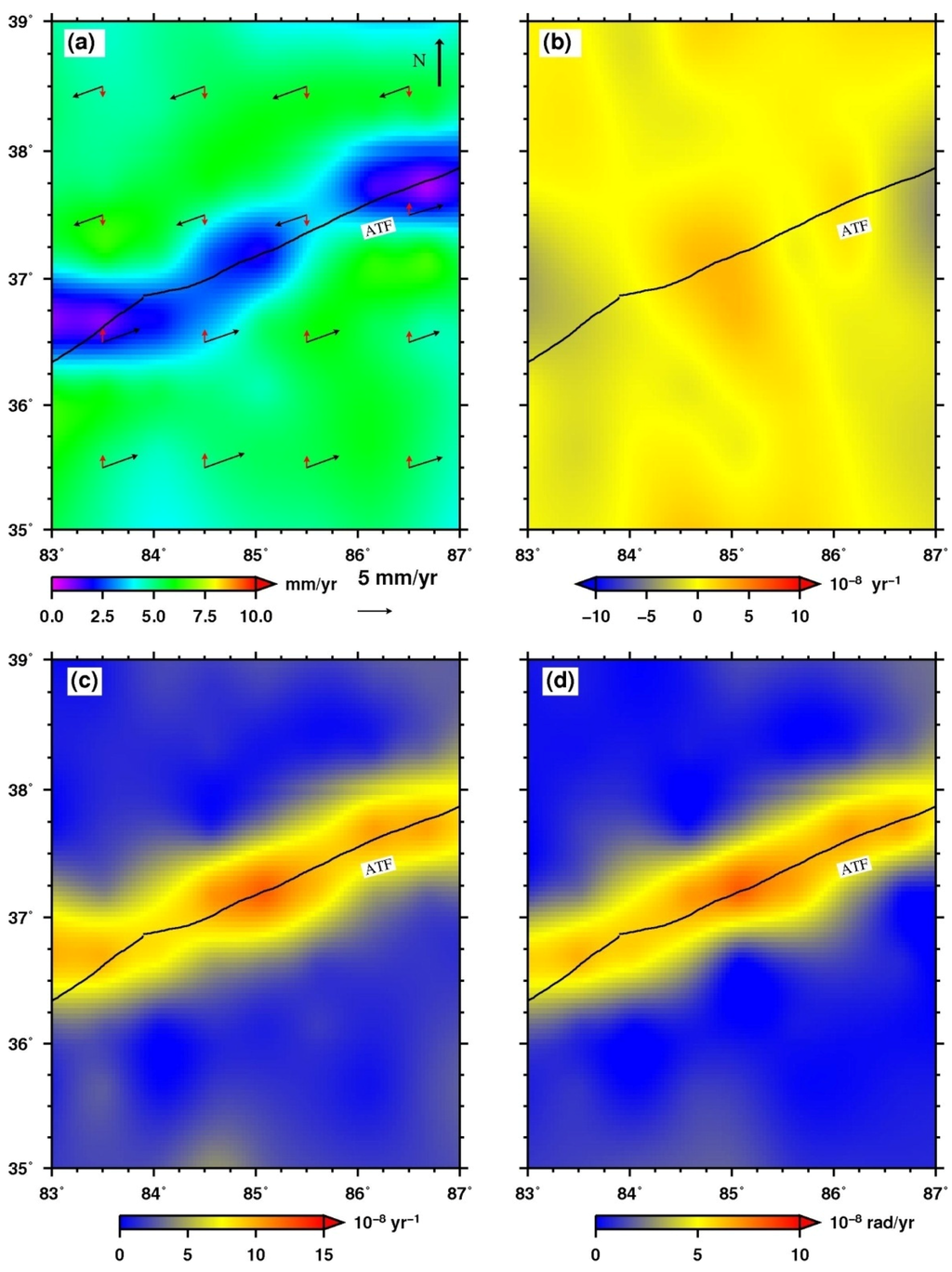 ATF strain map: (a) velocity map, the red arrows show the vertical velocity (directs north means upmotions and south means down motions) and the fat black arrow shows the north direction; (b) dilatation rate; (c) strain rate and (d) rotation rate.