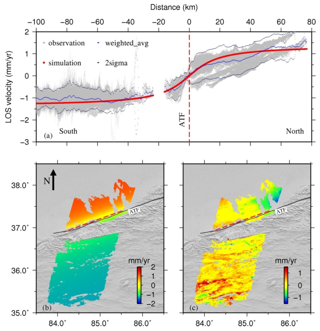 It is worth noting that we simplify the model by disregarding deformation produced by the other possible surrounding secondary faults in the study area. The real tectonic setting is definitely more complex than the simple model we have used in this study. The reasons we used this simple model are that reliable SAR data near the fault were not available, which may be insufficient for a distributed slip inversion in this case; and the fault-normal and vertical deformations across the ATF are relative less with respect the strike slip [1,2,14,15]. Our results may include contributions of surrounding secondary faults or other mechanisms like the shrinkage or expansion of clay minerals, or even excessive water pumping or significant seasonal variations of the water table. In addition, our SAR data covered only seven years, the low temporal resolution results prevent us from extracting the varying history of fault slip rate and locking depth. Our SAR data covered only a segment of the whole ATF, we assume that our results from SAR data can represent the first-order deformation characteristics of the ATF. The detailed deformation needs further geodetic or geological study.