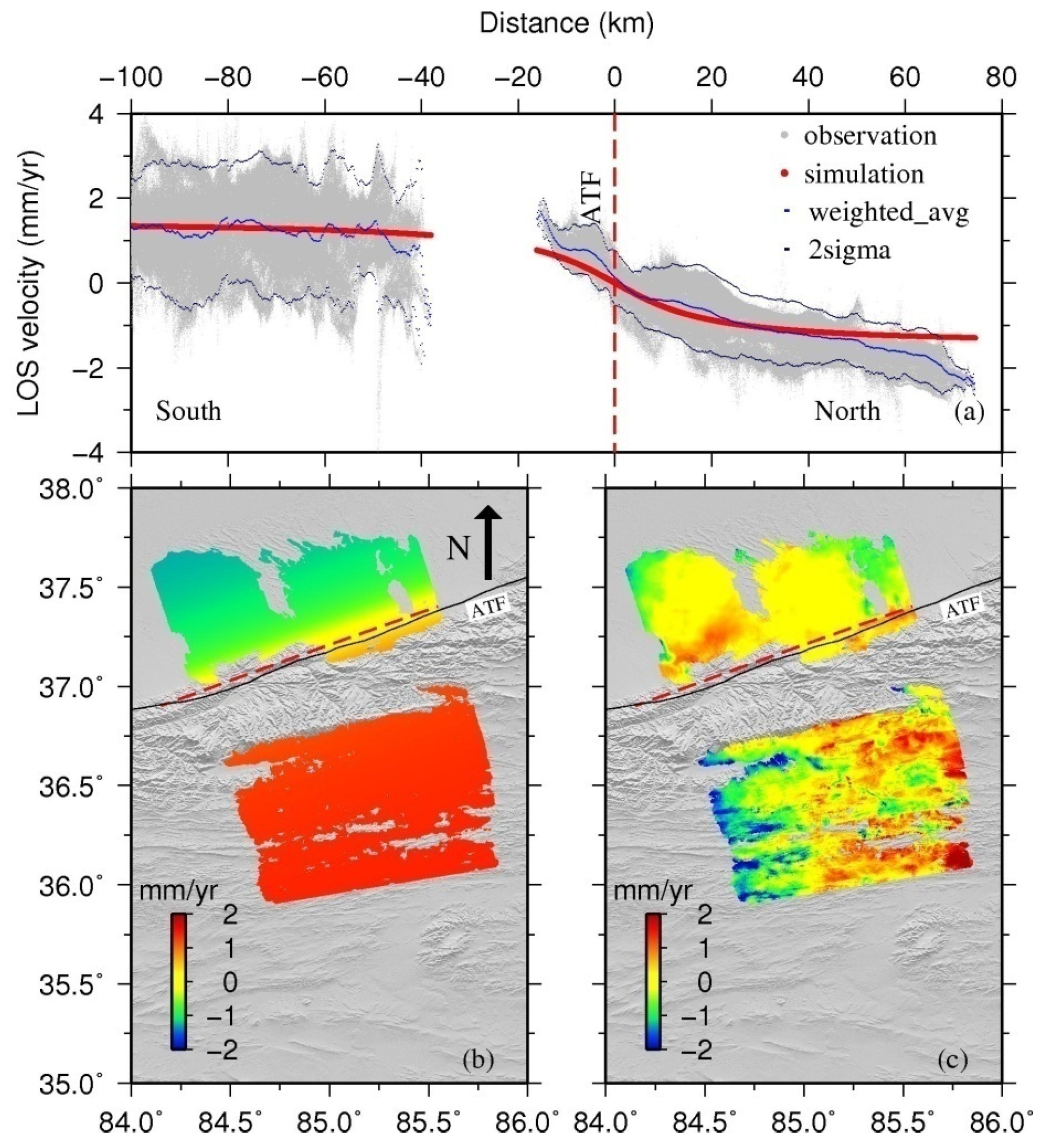 (a) A298 mean LOS velocity profiles (red dots) and the weighted average profile (dark blue) with 2σ deviation (light blue). All the points shown in the left are projected onto the profile as red dots. The red line is the best-fit model with a slip rate of 8.0 mm/year and 14.5 km locking depth; (b) Model simulation map from the best-fit model values. The fat black arrow shows the north direction; (c) Residuals between model and observation (Figure 5b) results.