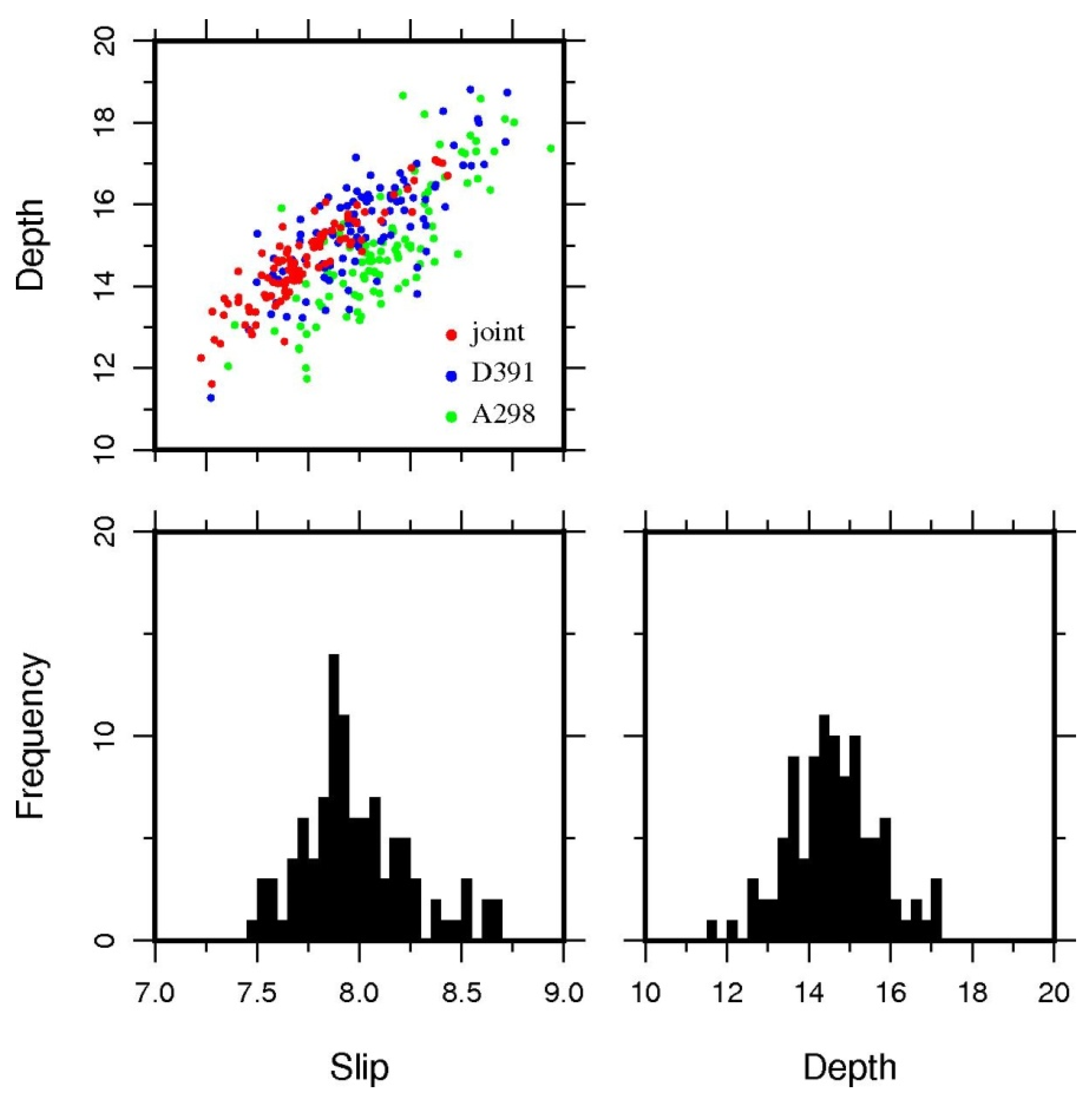 Results from the Monte Carlo error analysis. The red dots represent joint inversion whereas blue (D391) and green (A298) dots represent single inversions. The higher frequencies of slip rate and depth concentrate near 8.0 mm/year and 14.5 km, respectively.