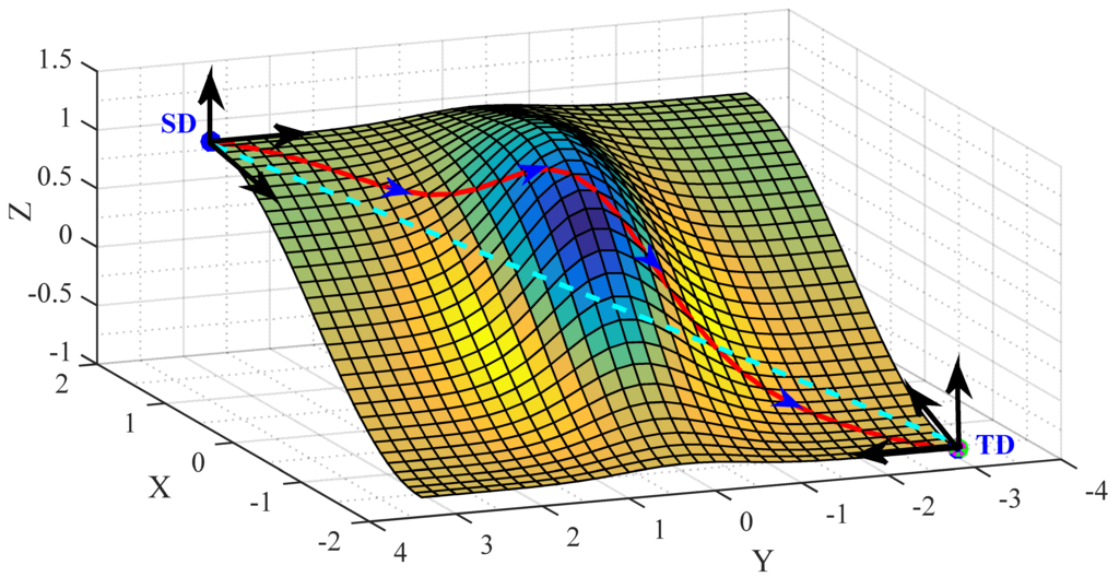 Let denote the sets of orthogonal basis obtained by a principal component analysis (PCA) in the source and target domains. Moreover, let represent the orthogonal complement to , i.e., . In a Grassmannian manifold, using the canonical Euclidean metric for Riemannian manifold, with the constraints and , the geodesic flow from to can be formed as [39]: