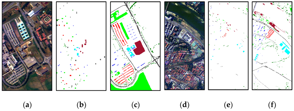 Color composite images of the (a) ROSIS Pavia University with the corresponding ground truths: (b) train map; (c) test map; (d) Pavia City Centre with the corresponding ground truths; (e) train map and (f) test map.