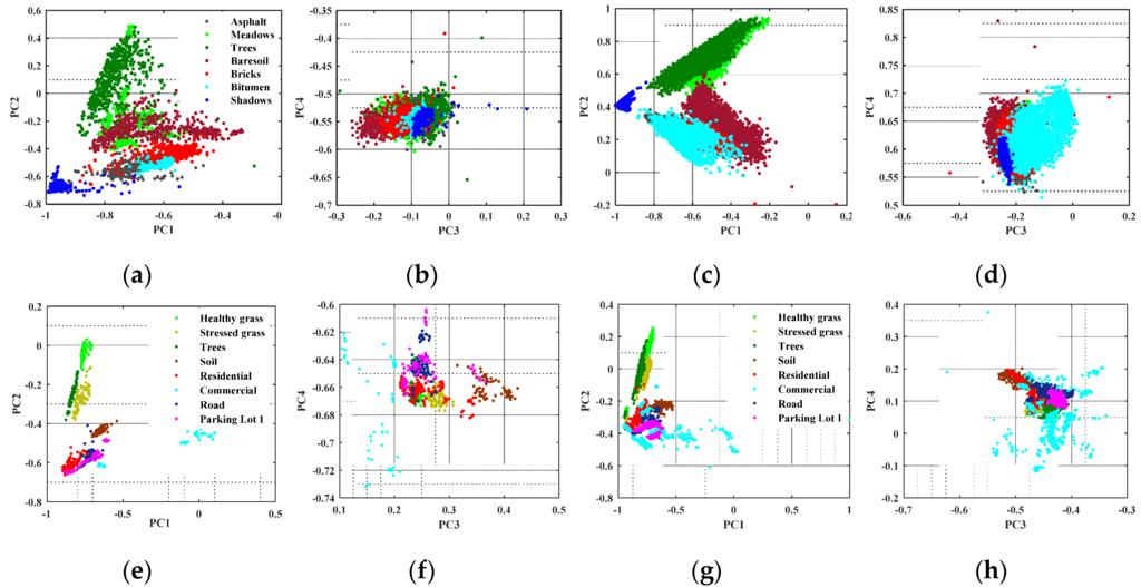 Principal component scatter plots of the source and target images for Pavia (University: (a) PC1 vs. PC2; (b) PC3 vs. PC4; Center: (c) PC1 vs. PC2; (d) PC3 vs. PC4 and Houston Left: (e) PC1 vs. PC2; (f) PC3 vs. PC4; Right: (g) PC1 vs. PC2; (h) PC3 vs. PC4.) data sets.