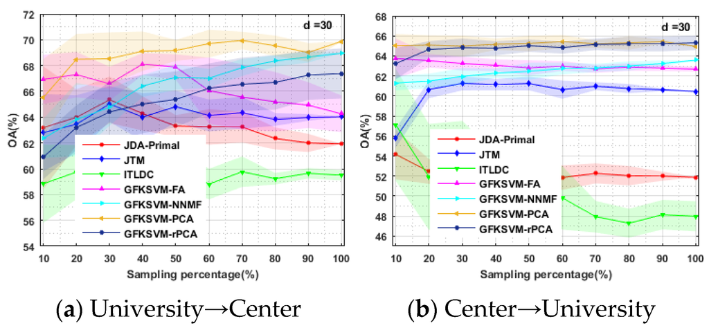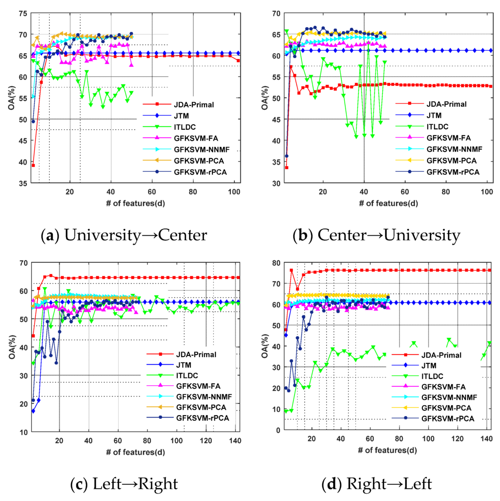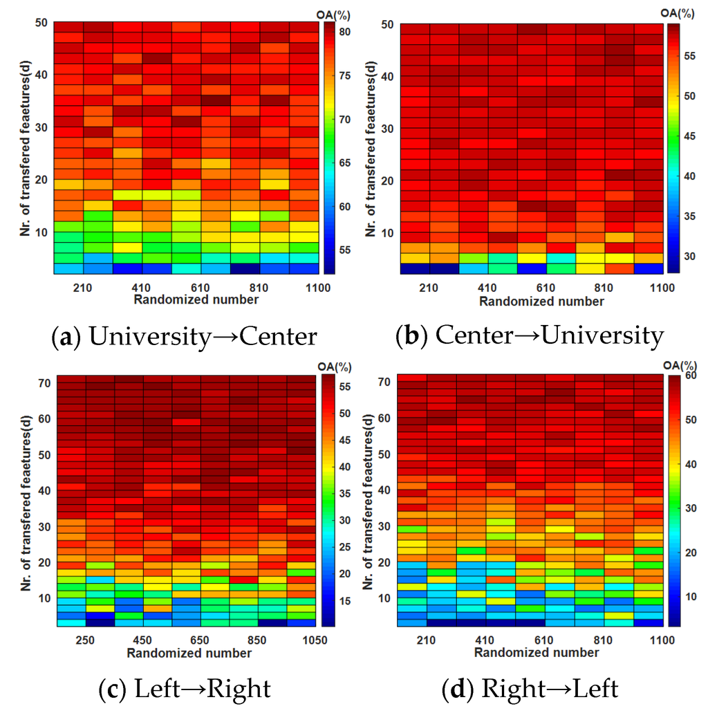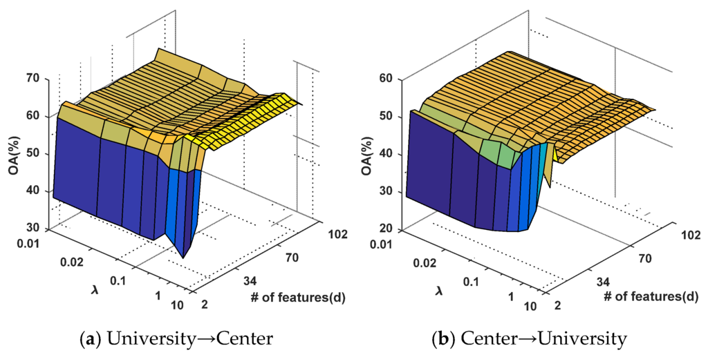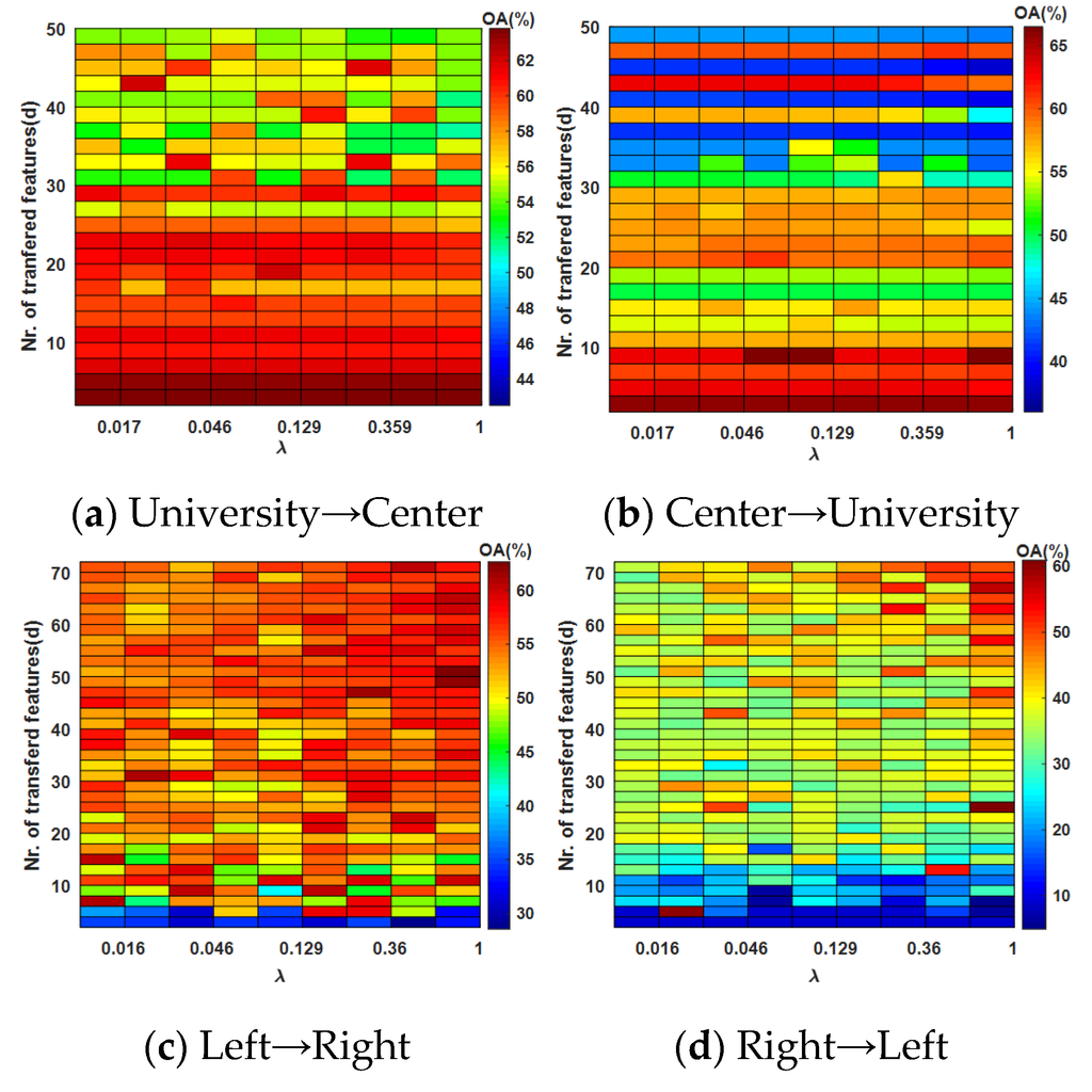 According to the results in Figure 8, a larger transferred feature number (d ≥ 10) leads to higher and stable OA values, but the main control power is retained by the regularization parameter λ. Indeed, with a constant and large set of transferred features, only the regularization parameter needs to be tuned.