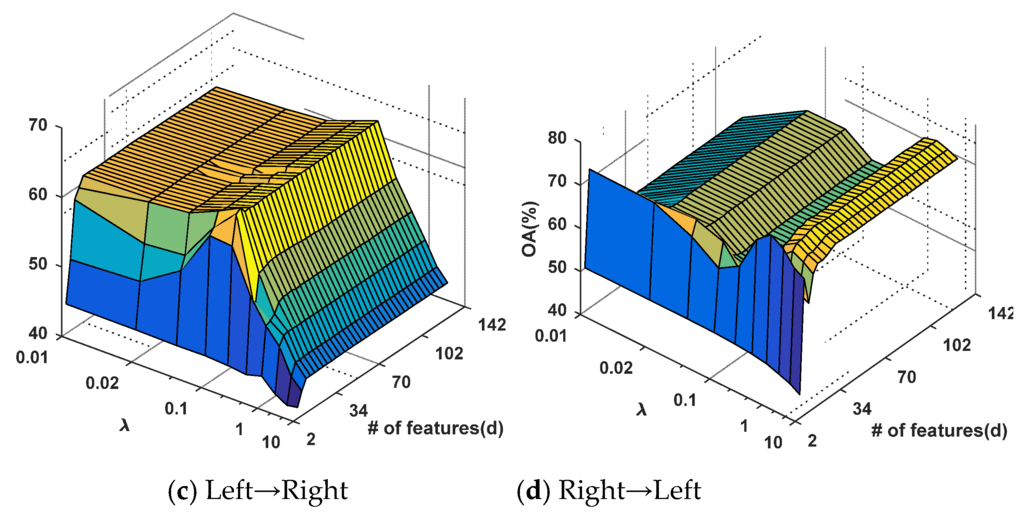 According to the results in Figure 7, the regularization coefficient does not show significant influence on the OA values. Instead, the effects of the transferred feature subspace (d) are quite obvious and different for different data sets. Specifically, the optimal transferred feature subspace (d) for the relatively heterogeneous ROSIS data is ≤26 for University (Source)→Center (Target) and ≤10 for Center (Source)→University (Target) DA learning. Instead, for the more homogeneous Houston data set, the larger the transferred feature subspace (d), the higher the OA value.