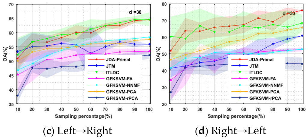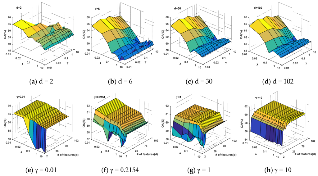 It can be observed that with a constant and large set of the transferred features (d ≥ 6), the performance of JTM for ROSIS data is mainly controlled by the regularization coefficient λ and the factor γ (Figure 9b–d).