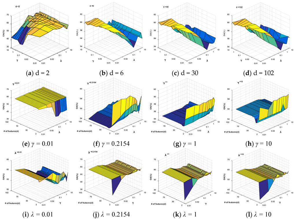 OA versus the number of features d, the SVM parameter γ, and the regularization factor λ of JTM for ROSIS data sets (University→Center). (a) OA versus γ and λ, d = 2; (b) OA versus γ and λ, d = 6; (c) OA versus γ and λ, d = 10; (d) OA versus γ and λ, d = 102; (e) OA versus λ and d, γ = 0.01; (f) OA versus λ and d, γ = 0.2154; (g) OA versus λ and d, γ = 1; (h) OA versus λ and d, γ = 10; (i) OA versus γ and d, λ = 0.01; (j) OA versus γ and d, λ = 0.2154; (k) OA versus γ and d, λ = 1; (l) OA versus γ and d, λ = 10.