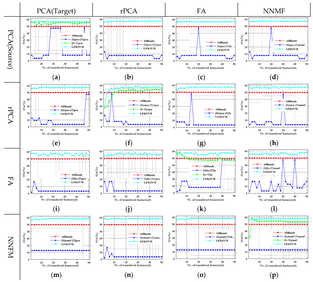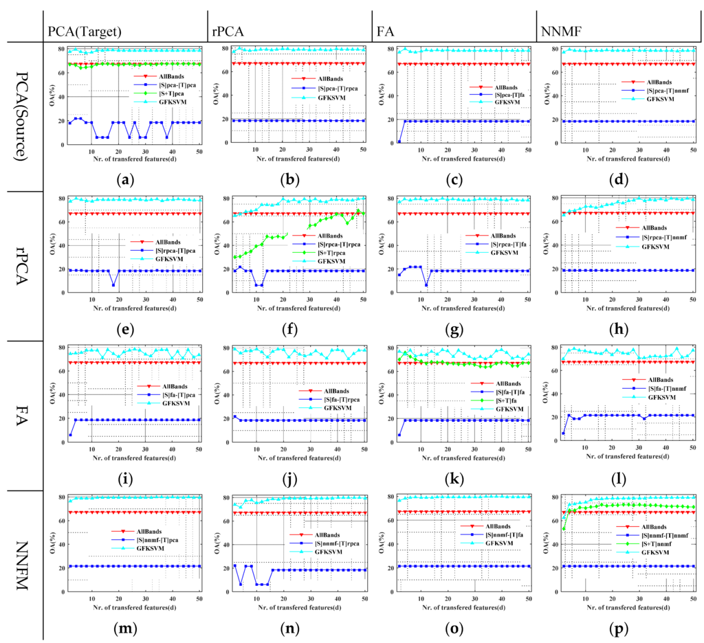 Figure 12 presents the results for GFKSVM with different subspace feature transfer approaches for Pavia, and Figure 13 presents that for Houston. Once again, all these results show that PCA based GFKSVM is more robust with respect to the dimensionality of the transferred features (d) than rPCA, FA and NMF approaches (Figure 12a,f,k,p and Figure 13a,f,k,p). Indeed, rPCA and NMF require a larger d (Figure 12f,p and Figure 13f,p). Instead, the poor performance of GFKSVM if rPCA is applied to both domains with small d can be significantly improved by replacing rPCA with PCA, FA or NNMF for one domain (see for instance Figure 11f vs. Figure 11e,g,h), Figure 12f vs. Figure 11e,g,h or Figure 13f vs. Figure 11e,g,h.