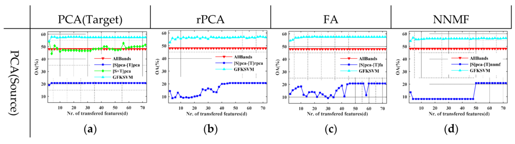 To complete our analysis, in Figure 11, Figure 12 and Figure 13 we report the results of a sensitivity analysis of GFK with respect to its critical parameters: the number of transferred features d and the adopted unsupervised feature transfer approach (PCA, rPCA, FA and NNMF). According to Equations (1) and (2), the number of transferred subspaces (d) was set to . Hence, the maximum d for ROSIS and Houston in Figure 11, Figure 12 and Figure 13 was set to 50 and 72, respectively. Moreover, according to the results shown in the previous subsection, the number of random features m in rPCA is set to five times the dimensionality of the original data. Finally, all results are compared with the results obtained by directly using RBF kernel based SVM on the original data. These results are considered as the evaluation benchmark.
