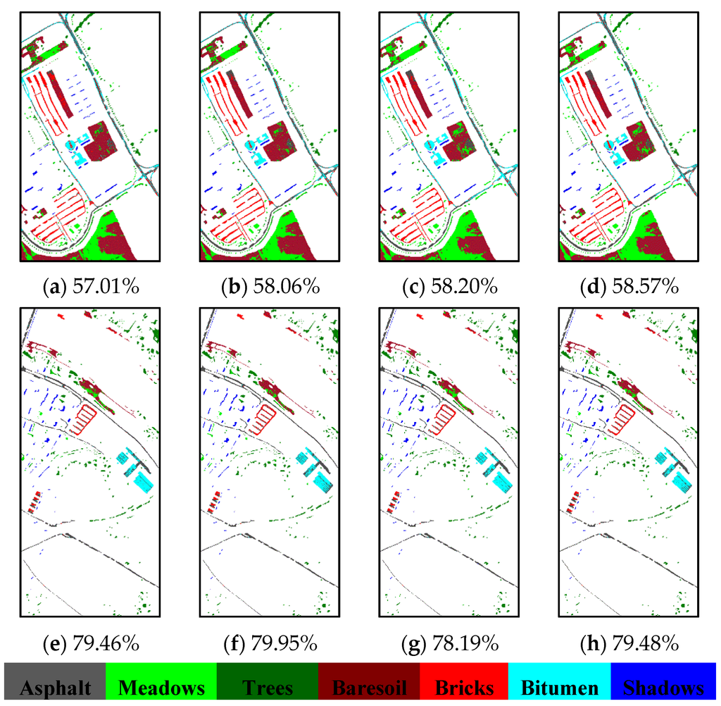According to the results in Figure 10, once again the larger numbers of transferred features (d ≥ 6, see Figure 10b–d), and smaller values for both the regularization coefficient (λ ~ 0.01) and the gamma factor (γ ~ 0.01) (Figure 10b–e,i) lead to the most effective results for the Houston data.