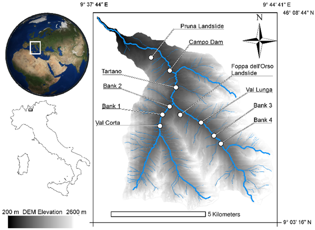 The case study discussed in this paper is composed of four riverbanks located in the Tartano Valley, an Alpine catchment in the North of Italy, 100 km away from Milan (Figure 1). Due to its hydrogeological peculiarities many authors focused their attention on this catchment [33,34,35]. The elevation of the basin varies in the range between 950 m and 2250 m a.s.l., with a mean altitude of 1861 m a.s.l. The main river in this valley, called the Tartano River, is a left tributary of the Adda River and in its upstream portion is divided in two secondary streams—Val Lunga and Val Corta. Downstream, the Tartano River flows in a wide alluvial fan that spreads over an area of approximately 2 km2. As indicated in Figure 1, this river is blocked by a dam (the Campo Dam).