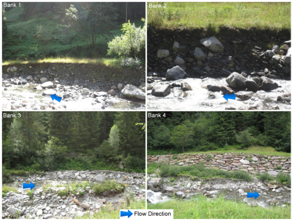 Starting from this point, the authors focus their attention on four banks located in this valley (Figure 1). The resistance of natural riverbanks to erosion is closely related to the geomorphic characteristics of the bank itself (Figure 2). Thus, four banks representative of different conditions of the river are chosen. The features of the testbeds are reported in Table 1 and depicted in Figure 3.