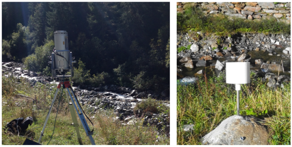 Investigating the spatial and temporal variations of riverbank erosion is a key point in understanding and monitoring the development of rivers as well as for estimating rates of sediment production [19]. Riverbanks in mountain areas are subject to high-energy flows as well as rapidly varying meteorological conditions, which makes them particularly susceptible to different instabilities and erosive activity with possible implications even in terms of flash floods involving large quantities of eroded material and resulting in enormous morphological changes [20,21]. The use of terrestrial laser scanning (TLS) [22,23] has become a well-established practice for detecting riverbank relief changes at different scales [24,25,26,27]. TLS may provide in a straightforward manner a detailed 3-D point cloud describing the topographic surface of the investigated area. By adopting a stable reference frame (e.g., [24,28]), multiple data sets can be compared to detect and map surface changes indicating erosion and/or deposition areas [19,27,29,30,31,32]. In particular, the ground-based location of the adopted laser scanning sensor can be exploited to obtain a suitable view over even steep riverbanks, as opposed to airborne laser scanning (ALS) which may encounter severe limitations to survey vertical banks. TLS exhibits various advantages over the use of other conventional methods such as erosion pins and total station surveying, which cannot provide the same spatial resolution and need longer time for data acquisition (see Section 3.1).