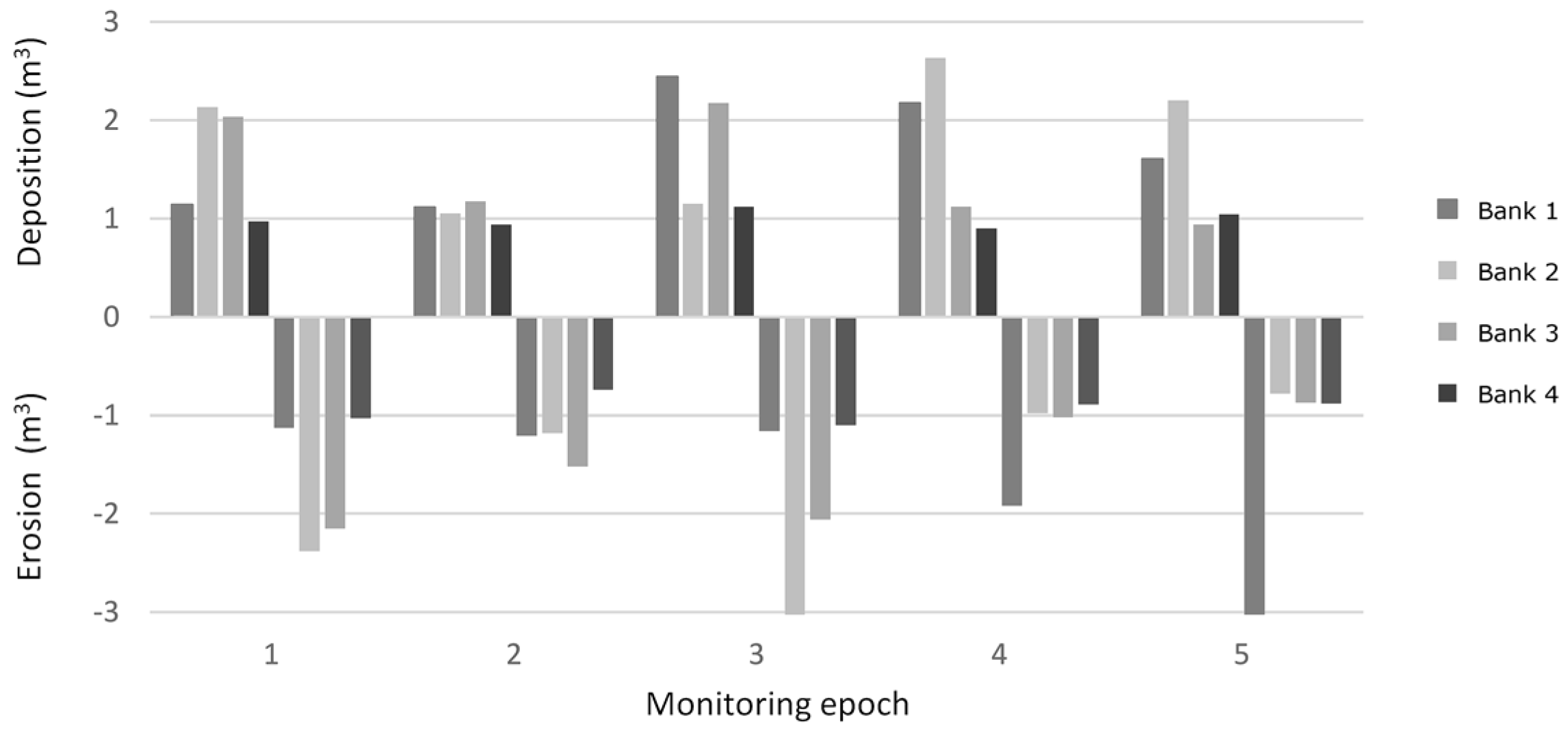 Bar-plot showing eroded and deposited volumes at each bank for each epoch.