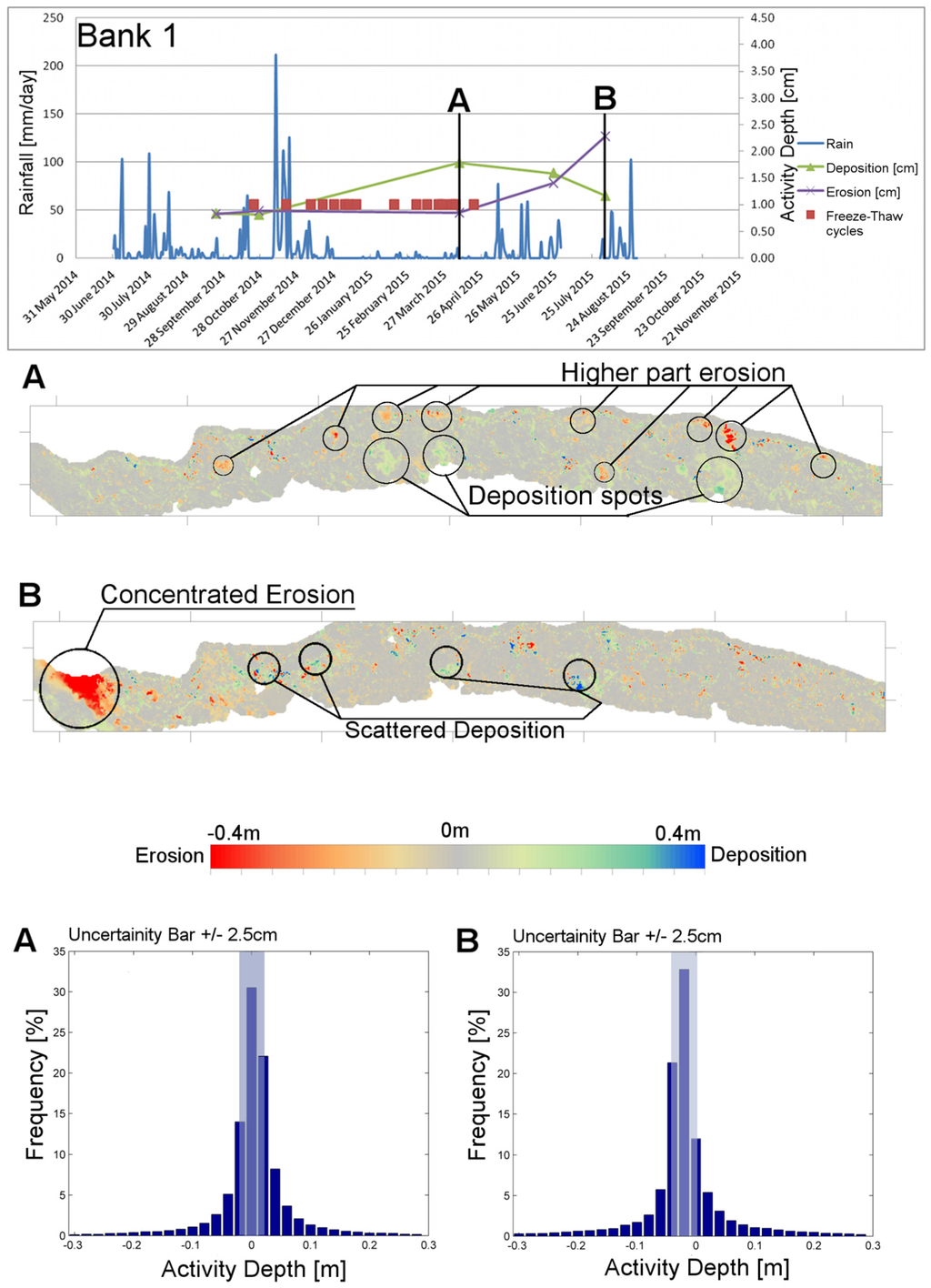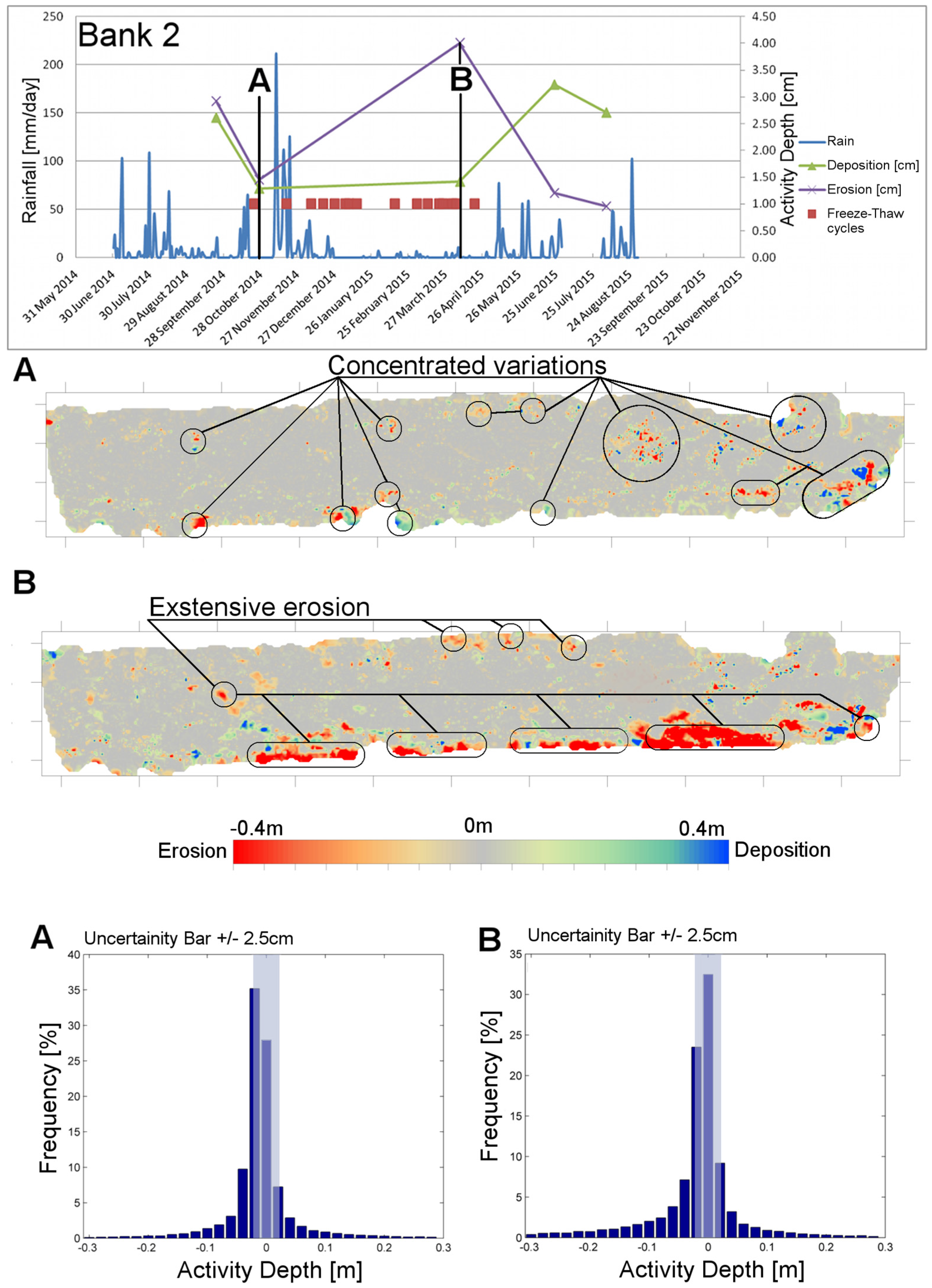 Activity graphs and change maps for Banks 1. Activity graphs summarize erosion and deposition depths in centimeters and display daily rainfalls in millimeters along with the daily freeze-thaw cycles. Change maps show the comparison between two consecutive scans with color scale corresponding to erosion (red) or deposition (blue). Only two comparisons are shown: (A) an epoch considered significant and (B) erosion peak epoch. For each epoch, bar graphs representing frequency classes for activity depth are shown for uncertainty evaluation.