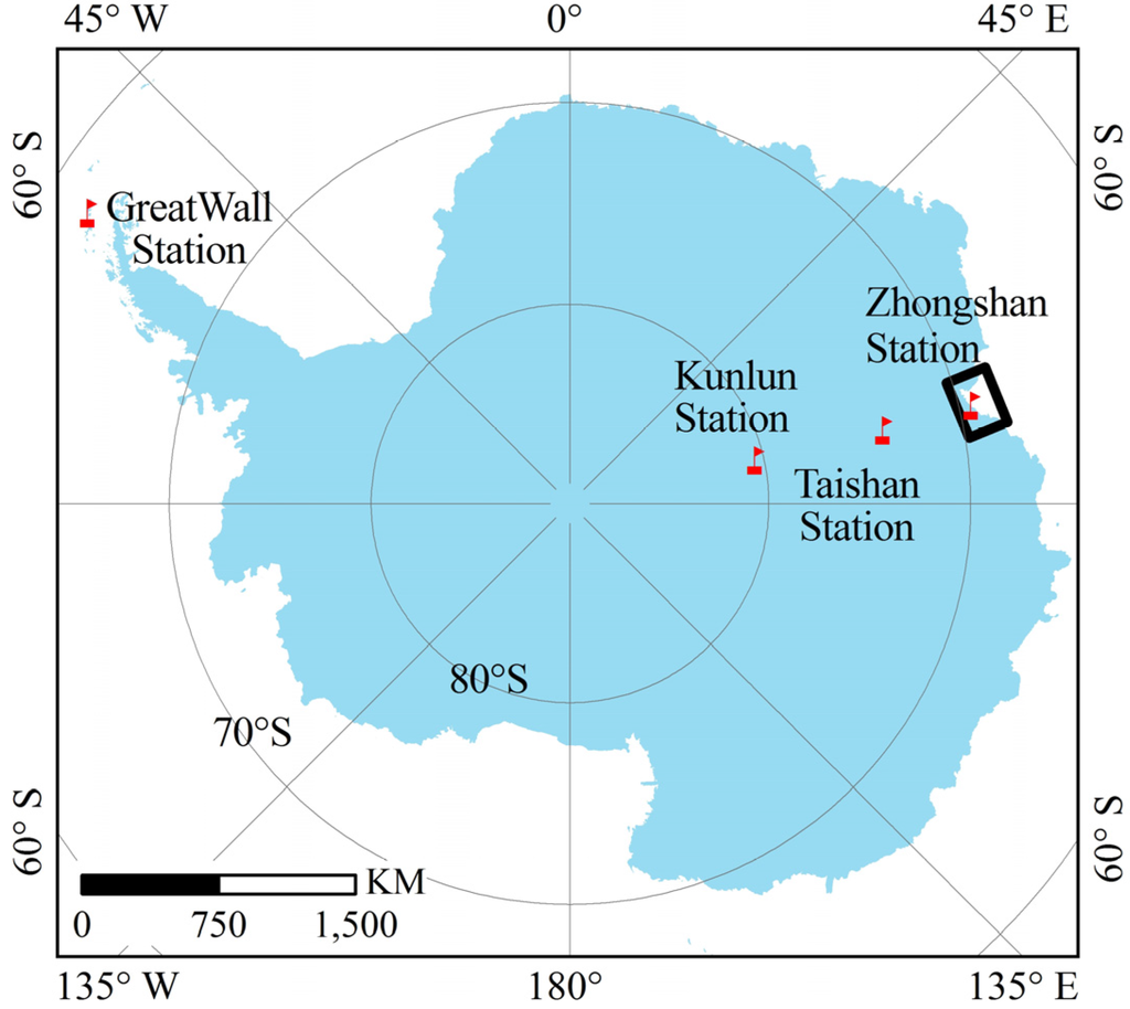 Map of the Antarctica showing the four Chinese stations. The black box over Zhongshan Station show Prydz Bay where the study was conducted.