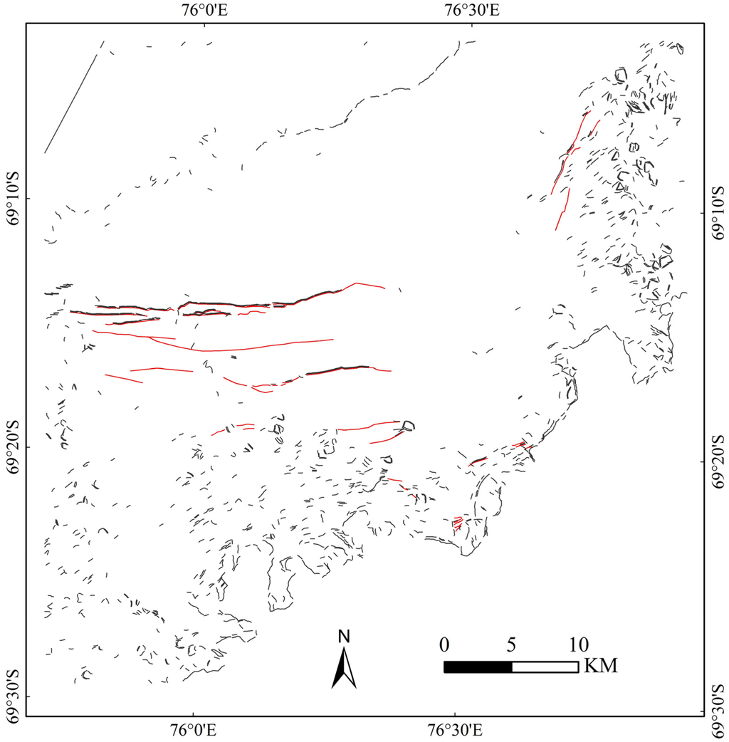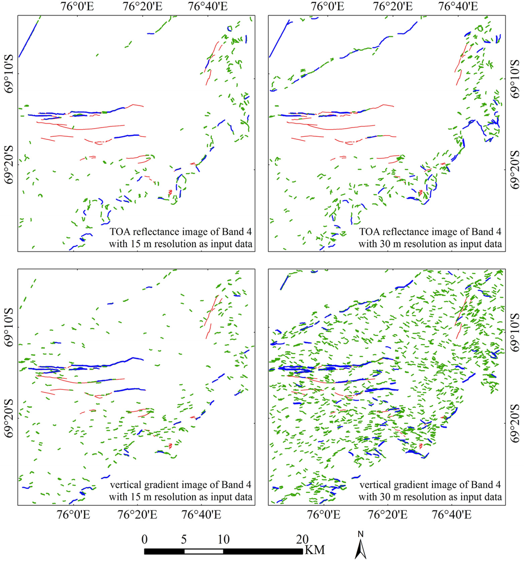 The parameters in the LINE module are same for all input data. The filter radius value is 3 pixels (a large value can result in less noise but much less detail detected), while the edge gradient value is also 3 pixels (a large value can create sparse pixels in the edge image influencing the subsequent lineament extraction process). The curve length threshold is 3 pixels and the angular difference threshold is 75 degrees (the value defines the maximum angle between two vectors that can be linked to form an edge segment). The threshold of the linking distance between edge segments is 3 pixels (the value specifies the maximum distance between two vectors for them to be linked). All parameters except for the angular difference threshold are suitable to obtain enough details about the edge, and the angular difference threshold set to be as 75 degree is to obtain longer detected line segments.
