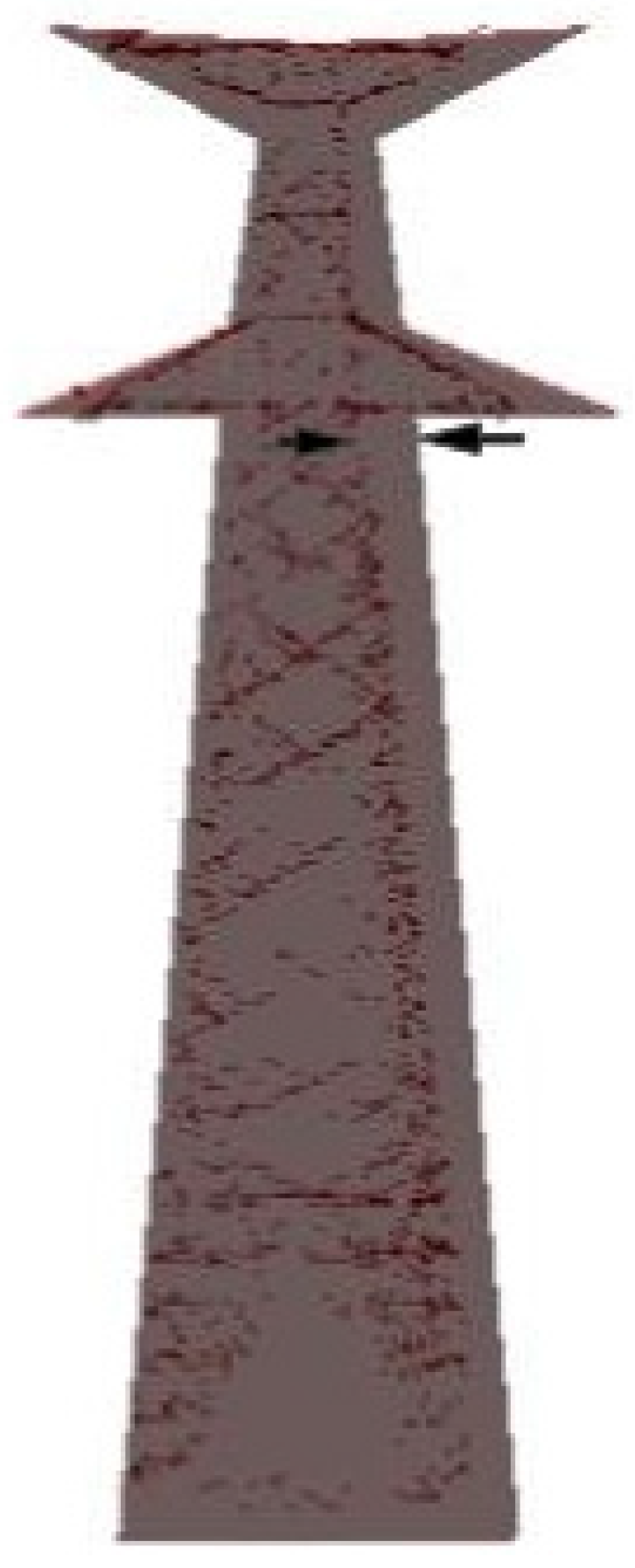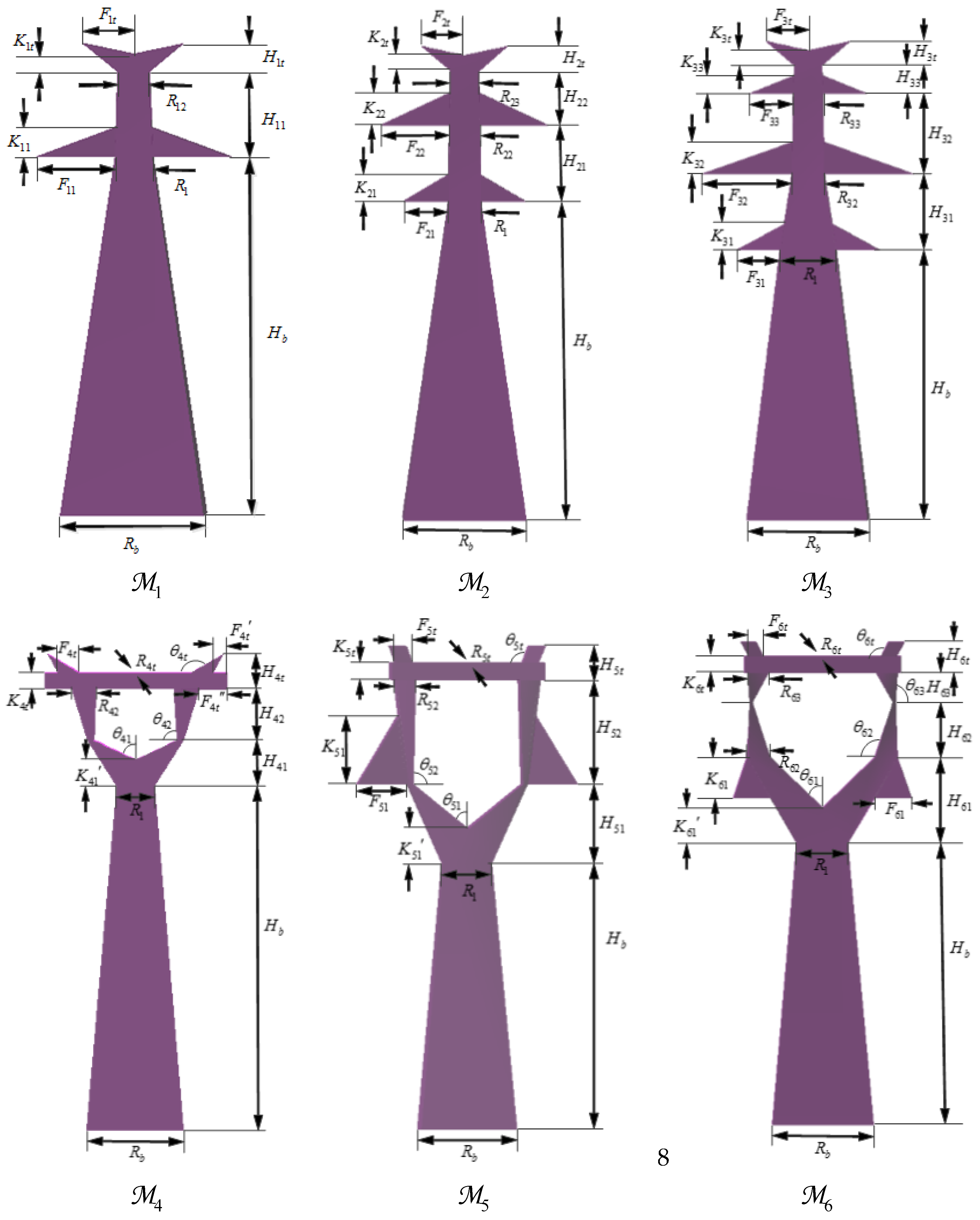 The content of the library is a very important thing: if it is too limited, the method loses generality. In this library, there are many of the common self-supporting pylons used in 220–500 kV power-line areas (Figure 1). The kinds of pylons included in this library are widely used in China. At present, ultrahigh-voltage power-line systems are still under development in China. However, the content of the library could be widened if the power lines are upgraded to a higher voltage rank. The pylons carrying the same power-lines are usually with same type and similar parameters. However, in order to overcome the effects of topography, some different pylons are compatible to carry the same power-lines. We defined the compatibility: (1) the models , , , and can be used to carry one group of power lines; (2) meanwhile, two groups of power lines are simultaneously carried by models and .