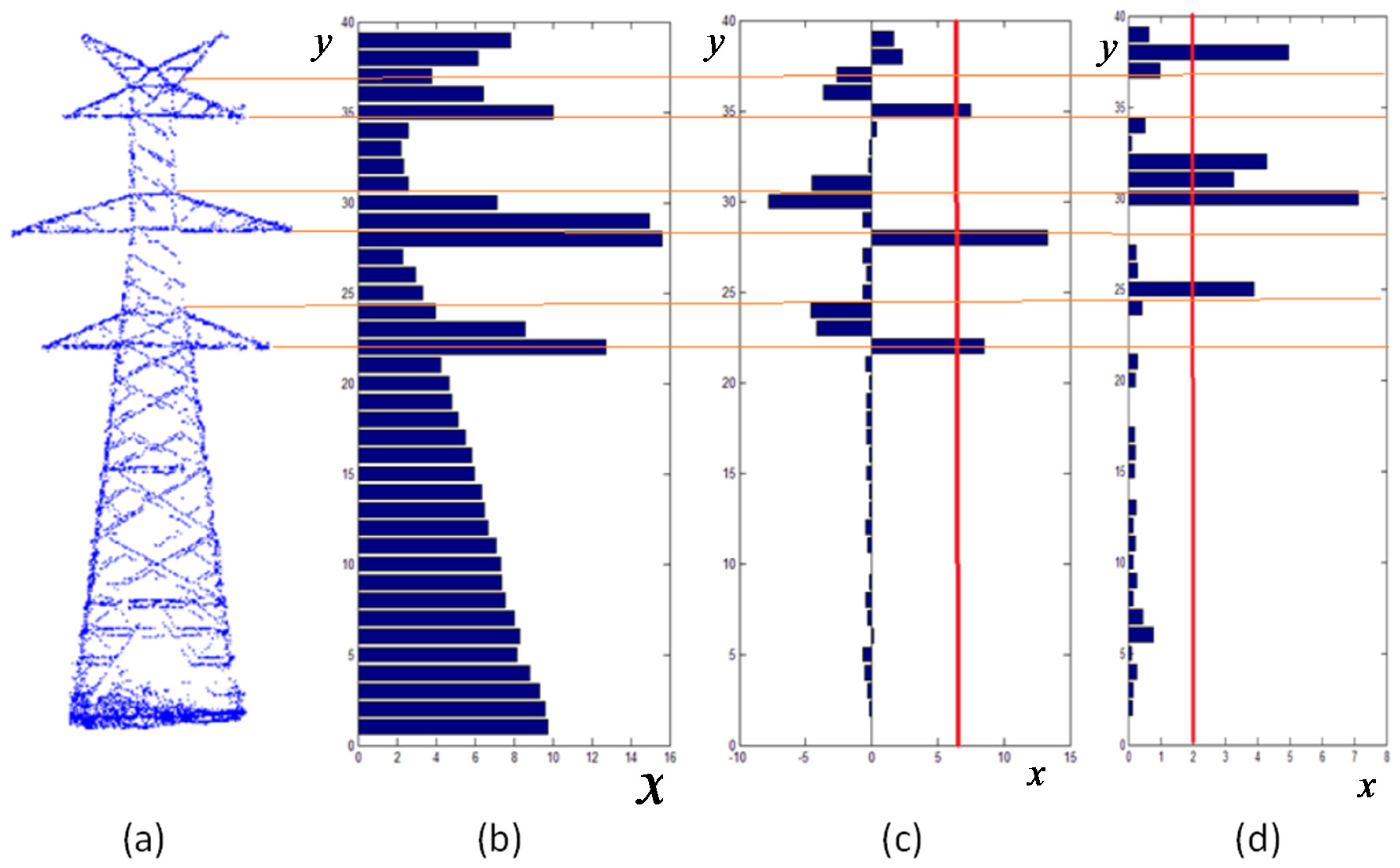 As seen in Section 3.1, the structures of pylons are regular, such as the cable arms being longer than their nearby parts. In order to determine the rough type and parameters of each pylon, we project all the points of a pylon onto its main plane (Figure 2a). A vertical profile is sliced into several bins of a certain distance. The histogram for the length of the sliced profile is shown in Figure 2b. The location of the arms can be determined by analyzing the changing length of the profiles. Usually, the projecting cable arms are longer than their nearby parts. The changing length of the arms can be represented using a derivative (Figure 2c). The pylon’s turning points, which represent the connecting locations of different parts, can be detected using a second derivative (Figure 2d). After determining the number and distribution of a pylon’s arms and turning points, we determine the rough type and parameters of this pylon by comparing it with models in the library.