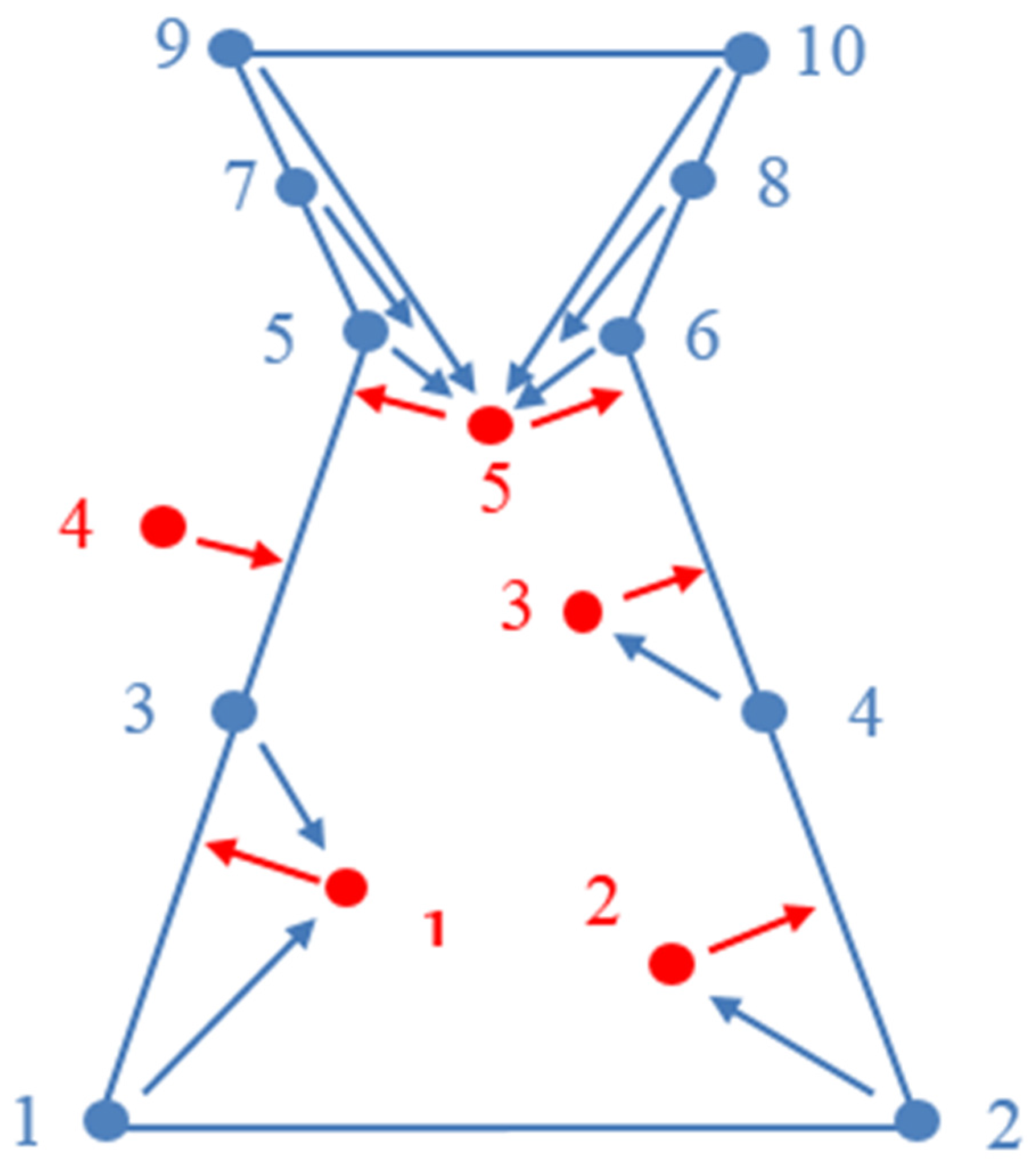 We now explain how the data term , mapping from a reconstructed object to be a real number, quantifies the relevance of an object with respect to its corresponding laser points. We naturally calculate the distance and measure the difference. The shorter the distance, the more likely the probability of finding a good object. The shapes of the pylon model represented using non-convex polyhedrons with multi-faces are complex. A shape may cause deviation if only the distances from the laser points to an object are used. As shown in Figure 3, the part of the object that is higher than red point 5 is a vacancy without any laser points. However, the closest distance from red point 5 to the object cannot touch that part. Therefore, we design the distance with two mutual parts: (1) a normalized distance from the point set to object (denoted by red arrows in Figure 3); and (2) a normalized Hausdorff distance from the key point set (corner points and central points of faces) of object to the measured point set (denoted by blue arrows in Figure 3).