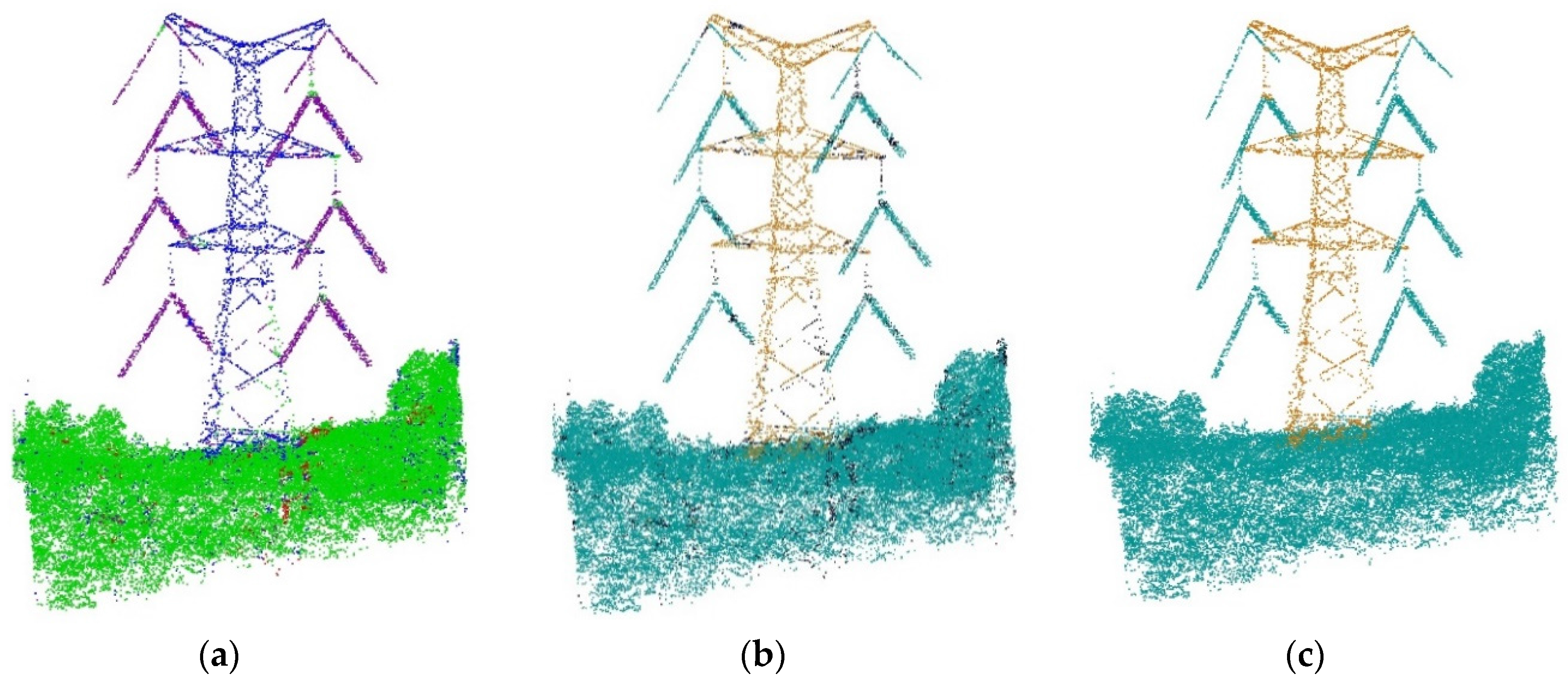 Figure 4 shows the foreground/background segmentation for a pylon neighborhood. Figure 4a shows the initial classification using the JointBoost classifier and local features, where it can be seen that there are many error points in the pylon. Figure 4b shows the foreground and background seed points. As for segmentation, points in the reliable pylon are treated as the foreground seed points, while points in other reliable objects (power lines, vegetation) are treated as the background seed points. Figure 4c shows the segmentation results, where it can be seen that the segmentation results are smooth.